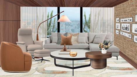 Otra de las áreas que conecta directamente con la terraza es el estudio, en este resalta la calidez aportada por el revestimiento de la pared focal en madera, en la que se aprecia un mueble multiusos diseñado a medida para el espacio; un moderno sofá de esquina junto a algunos elementos de contraste completan este ambiente dando lugar a un espacio acogedor y contemporáneo.