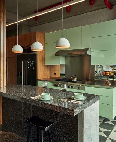La cocina fría fue diseñada haciendo uso de una ligera textura de madera en tono arena con topes y respaldo en un cuarzo de ligeras vetas con apariencia de mármol Calacatta, esto con el objetivo de resaltar la sensación de amplitud, orden y serenidad; una península con tres banquetas de roble y piel enlaza conversación con el área de comedor.