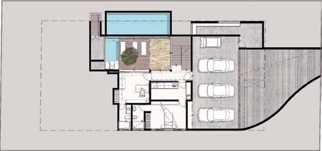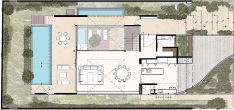 Desde la conceptualización arquitectónica, la distribución de áreas se realizó buscando tener continuidad espacial en la zona social e integración de estos espacios interiores con el exterior; de ese modo, la sala, el comedor, la cocina fría, el estudio y el área de barbacoa se desarrollan en conexión con la terraza principal. Esta se extiende a todo lo largo de la piscina y permite visibilidad al espacio abierto del campo de golf.