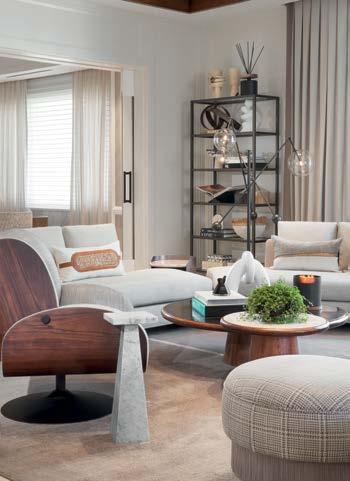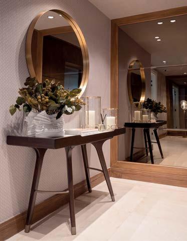 En el recibidor destaca un diseño elaborado en roble brasileño y MDF, haciendo que las paredes creen un recorrido visual y al hagan resaltar la imponente obra de arte y el espejo que aporta profundidad espacial, dando unidad al resto de los elementos del espacio.