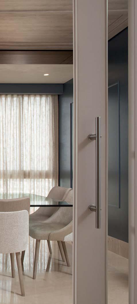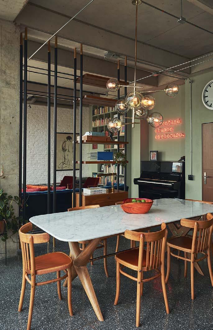 El recorrido continúa hacia el comedor para ocho comensales, donde se aprovechó un excedente de espacio generado por la posición de una columna para insertar un mueble de estantería diseñado a medida, el mueble cumple función de almacenaje para vajilla, copas, y otros utensilios de uso cotidiano en torno al comedor. Se buscó crear un espacio ligero que fuera práctico para el uso diario. En conexión con la cocina fría, este espacio constituye el corazón del hogar, uno de los espacios de mayor uso y en torno al cual tienen lugar importantes momentos familiares día a día.