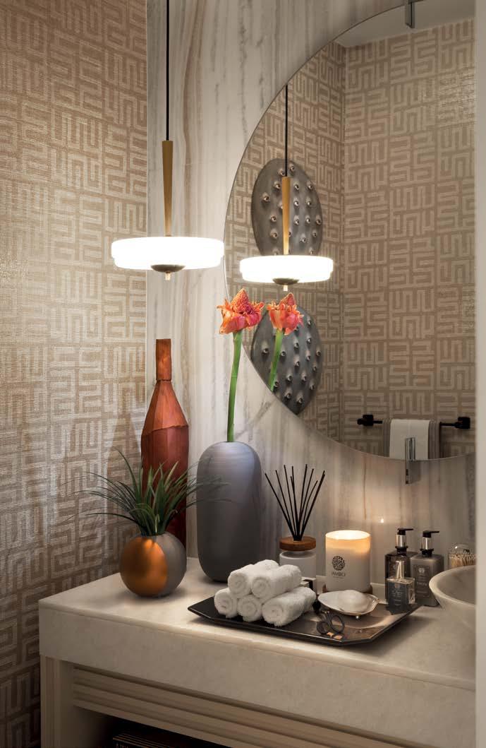 se diseñó un lavamanos fabricado a medida en cuarzo que, que junto a los acentos de iluminación, es sin duda el protagonista del espacio.