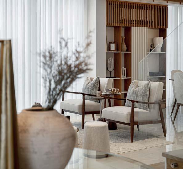 Para la sala principal el diseño parte de textiles en tonos claros para aportar ligereza, contrastando con el sólido terracota lavado de las butacas y la madera nogal de una de las mesas de centro, siendo estos los elementos de acento. La misma paleta de colores se extiende hacia el comedor formal, en el que la neutralidad del papel tapiz da en este caso el protagonismo al arte abstracto, las obras “Santa Fé horizons” a la izquierda y “Where the colors” a la derecha aportan un pop of color con tonalidades que evocan la naturaleza.