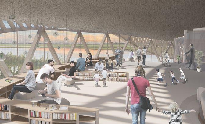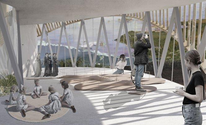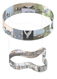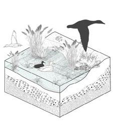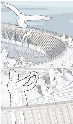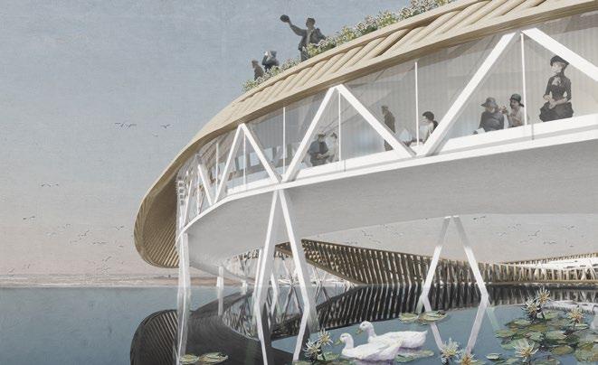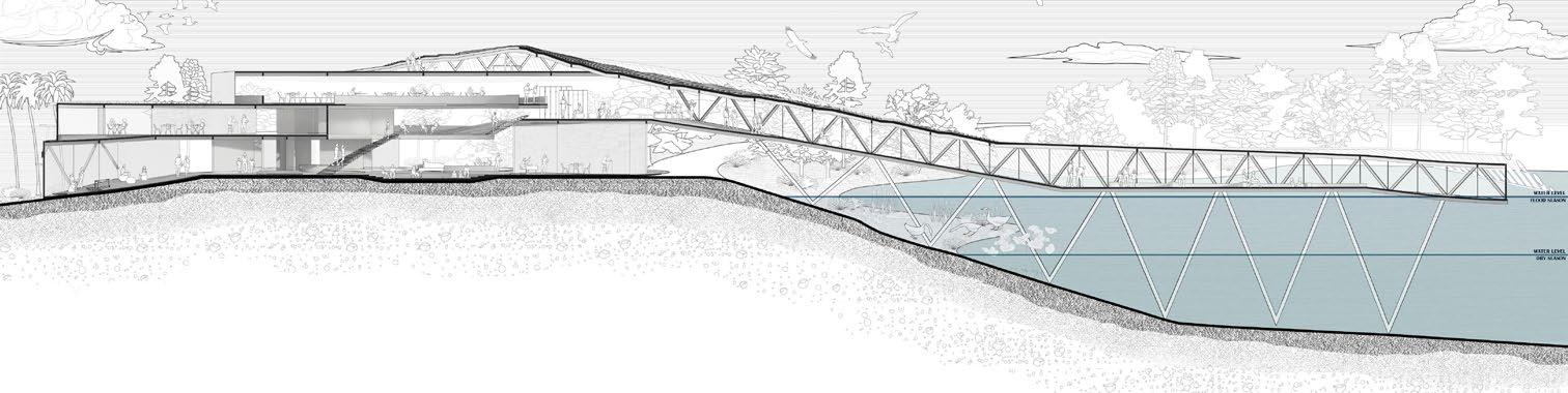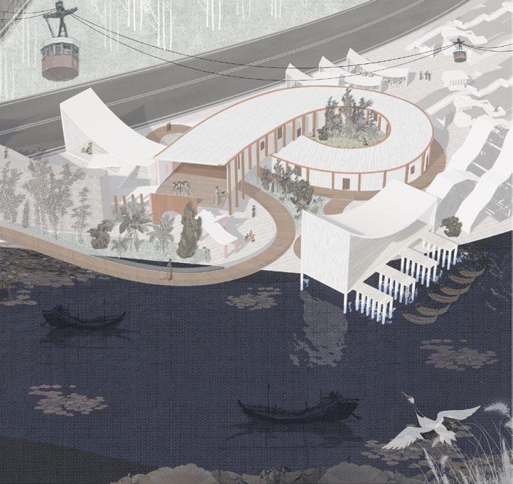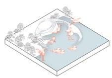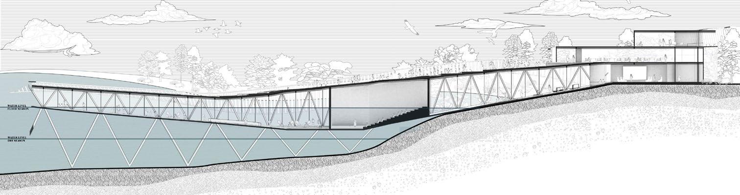 During the flood season, buildings are partially submerged, and people can see different bird activities underwater. People have a richer experience in the building, and the roof of the building is also partially submerged. People can further interact with birds at the large stairs on the roof.