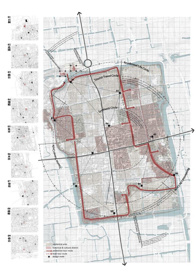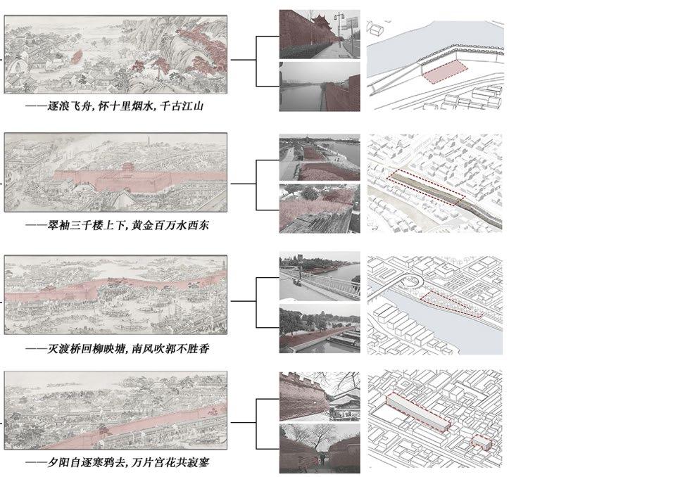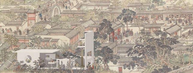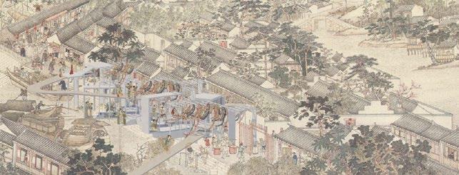 Therefore, we extracted 9 nodes with strong traditional Suzhou cultural charm, then analyzed and studied the spatial form, functional composition, and crowd dynamics of these nodes. Modern architecture can also narrate the events in the painting.Through translating these 9 nodes and placing them again in the city of Suzhou, we hope that they can activate the surrounding community while linking up a tour path back to the "Properous Suzhou". Therefore, using the old city wall as the main narrative line, we constructed a new tour route to stitch together the scattered and isolated historical areas to tell the story of Suzhou.