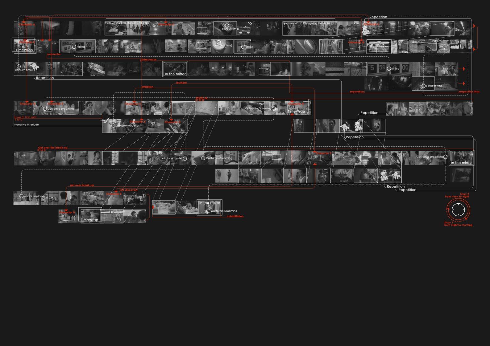 The movie Chungking Express consists of two stories about the subtle transformation of feelings between two pairs of men and women under the concrete forest. Its movie structure is symmetrical, with the two stories of night and day heading towards different endings. A lot of contrasts are used in the drama, with fast showing slow and cold showing warm.