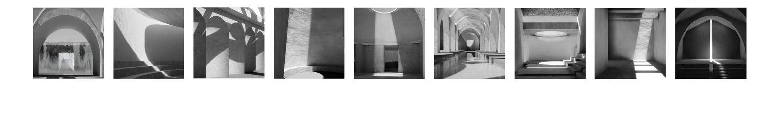 Walking through the narrow stairs to the underground, walking through the arcade of intertwined light and shadow, the huge dome space is revealed in front of you, the light shines from the circular hole in the dome, and time crawls through the circular wall. After bathing, you go up the huge steps. The light passes through the gap in the end wall and becomes a guiding point. Going around the wall, the transparent dome presents everything outside in front of you.The story reaches its climax here.