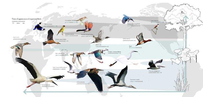 The Bolabi Lake wetland is an important habitat for birds and a destination for many migratory birds, especially waterfowl. Bolabi Lake is located in the agricultural area of Nakhon Sawang Prefecture, Thailand, and lacks a building that offers a rich experience of bird observation, interaction, and entertainment. There are no less than 238 species, 20 orders, of birds in Lake Borabi. According to their ecological habits, including foraging, resting, and reproductive activities, birds of 20 orders can be divided into 7 ecological groups: migratory birds, wading birds, climbing birds, walking birds, flying birds, songbirds, and raptors.