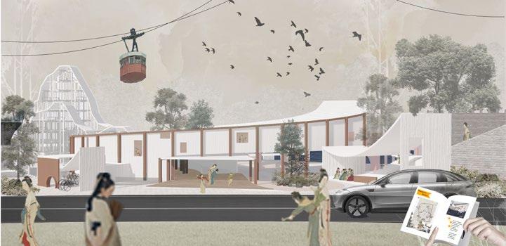 Using the imagery of the cascading rooftops of the Jiangnan houses, a new path on the rooftops has been constructed. As a main cable car station, it connects to other nodes, and provides efficient traffic way for travellers. The cable car offers visitors the possibility to admire the fifth façade of the old city of Suzhou from the air.
