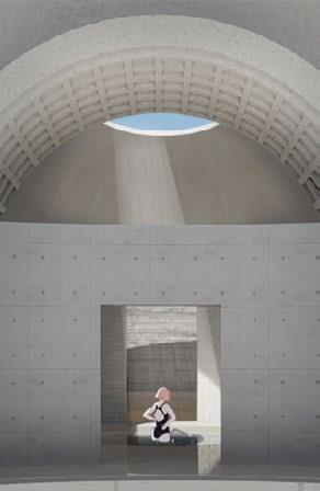 people soak in the central bath, the circular wall made of fair-faced concrete blocks the line of sight, allowing people to focus more on the current environment. The huge dome is unreachable, with a large circular hole cut out of the top. Sunlight shines in from