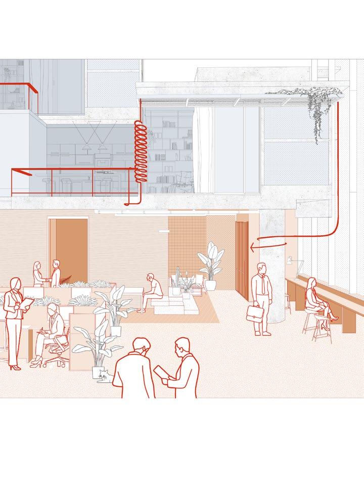 Located at the cross-floor area of the office building, such as the hall, connecting the vertical core.
