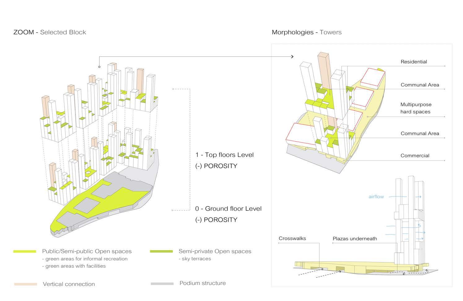 As a result, the ratio of open space per inhabitant has been doubled thanks to the porosity strategy for the maximization of the airflow. Although the differentiation in size and functions of the emergent and distributed open spaces brings about diversity in the patch, their location on multiple levels could require a higher complexity of vertical connections to allow a fluid pedestrian mobility.