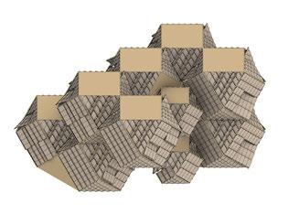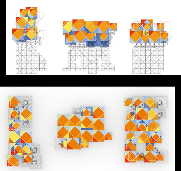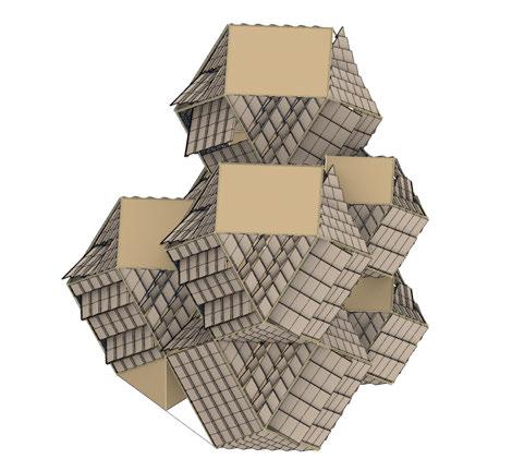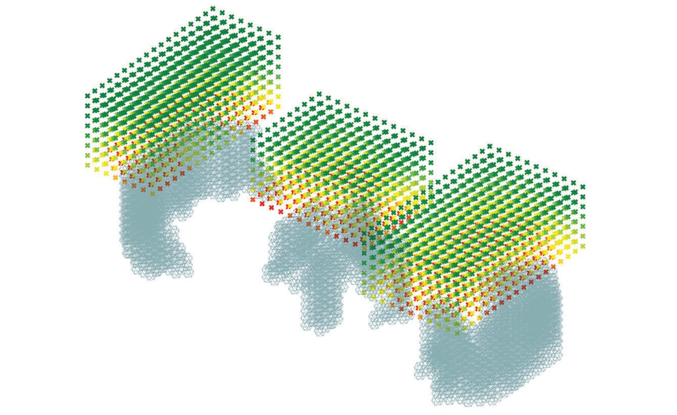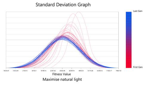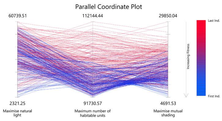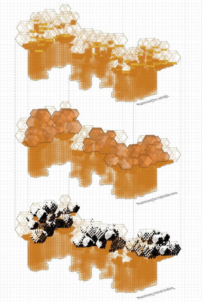 For the habitable units configuration, factors such as maximum natural light, maximum number of habitable units and to maximise mutual shading were considered. To achieve the optimised configuration, a multi objective evolutionary algorithm was performed on the geometry.
