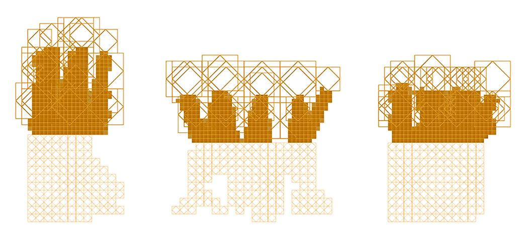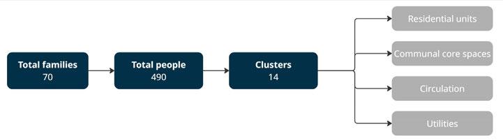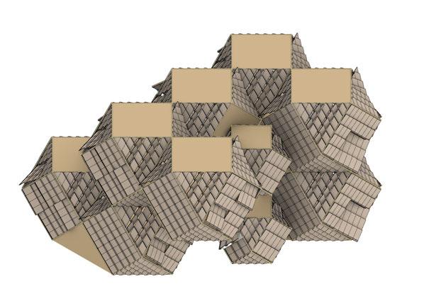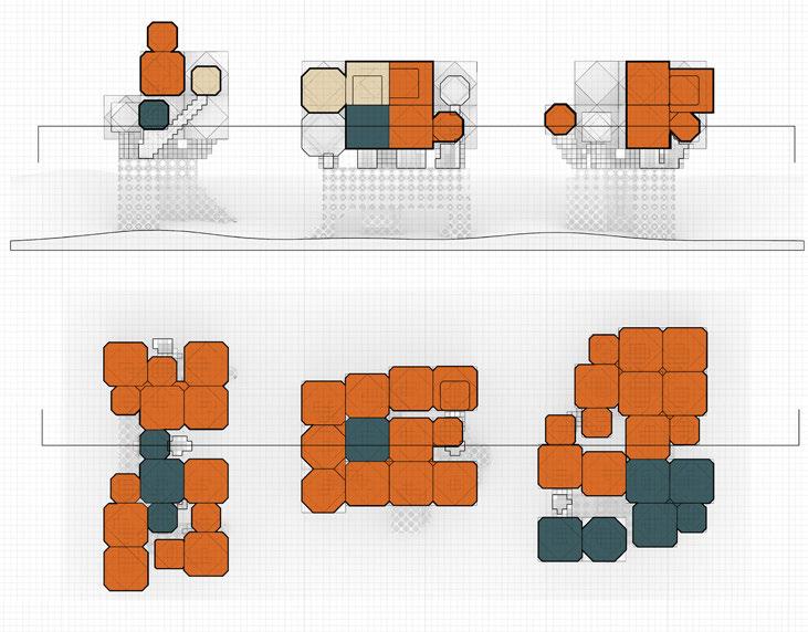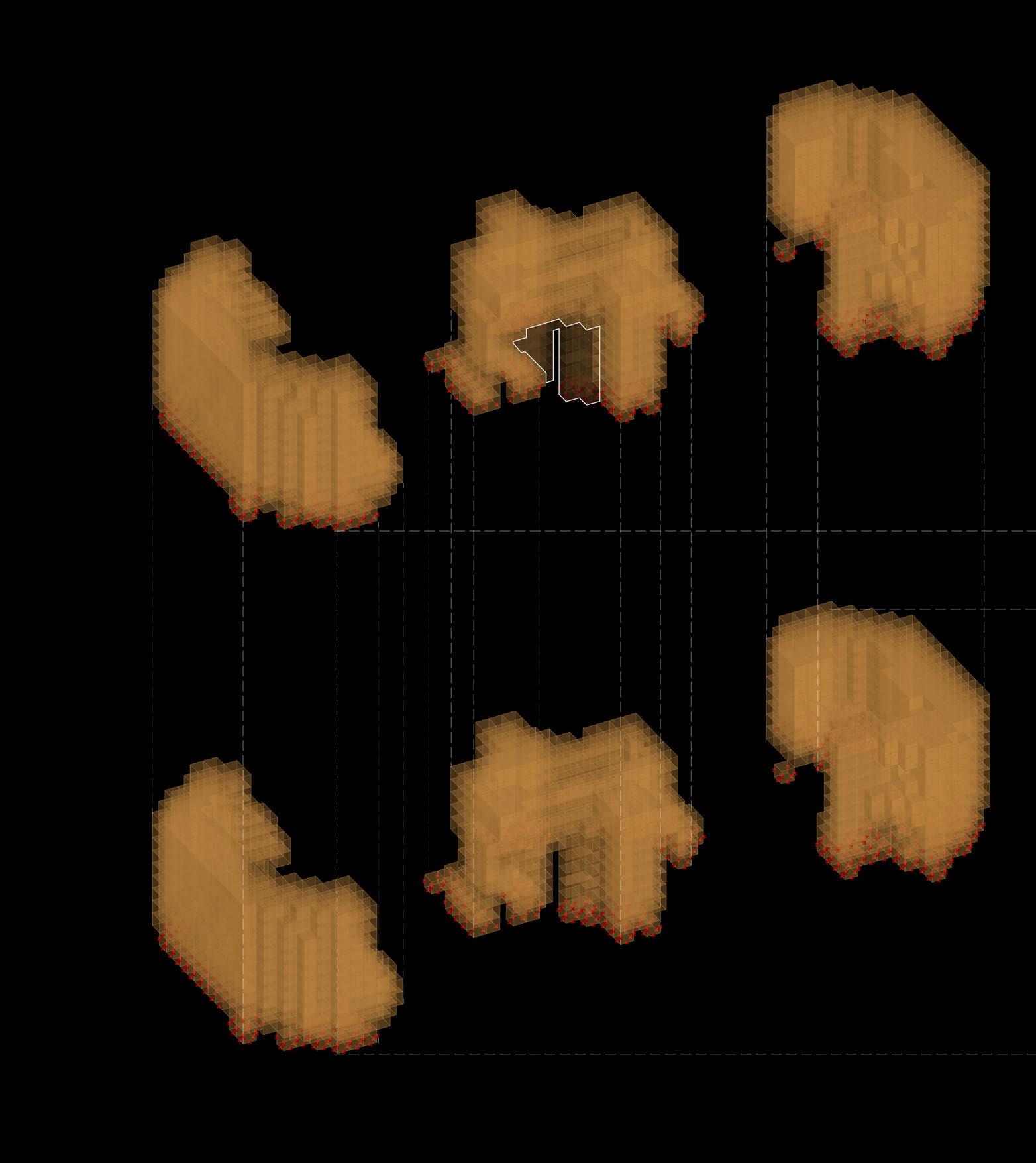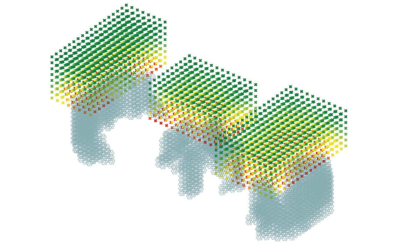 For the habitable units configuration, factors such as maximum natural light, maximum number of habitable units and to maximise mutual shading were considered. To achieve the optimised configuration, a multi objective evolutionary algorithm was performed on the geometry.