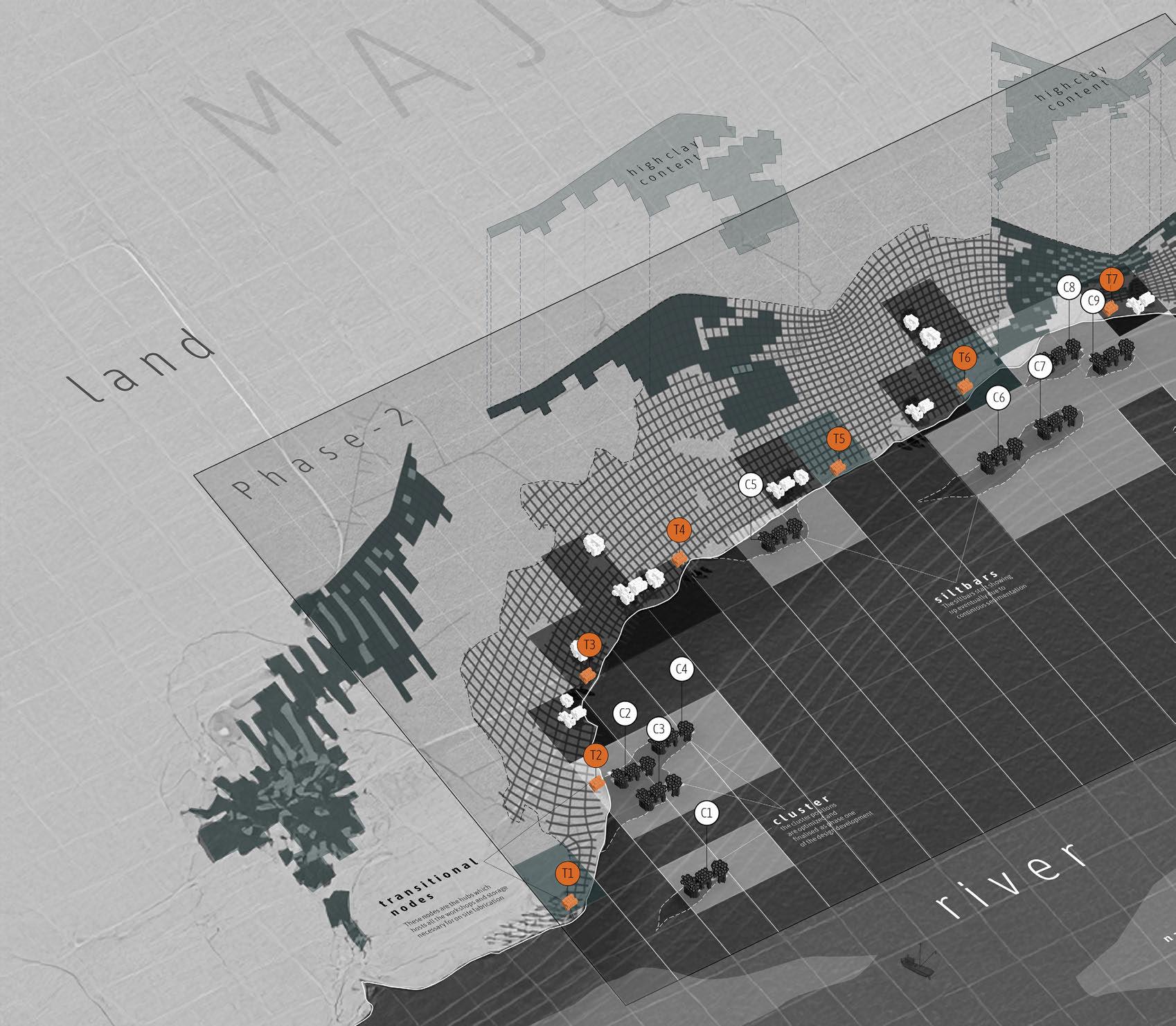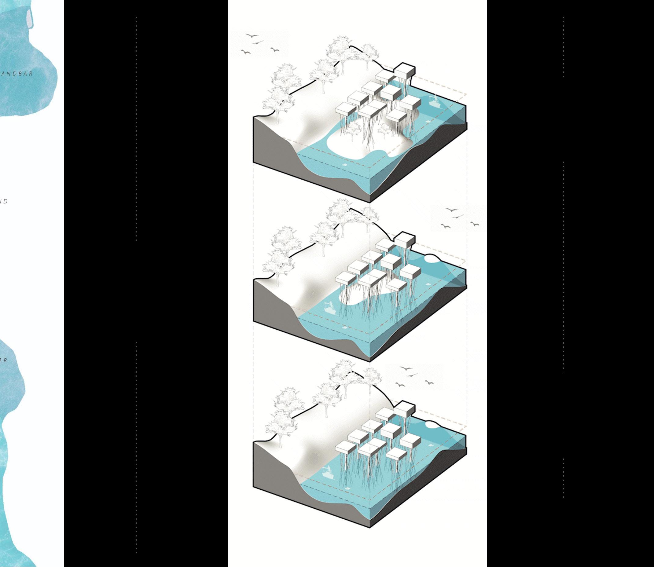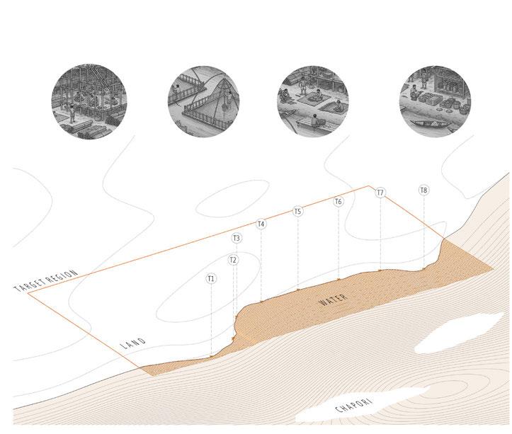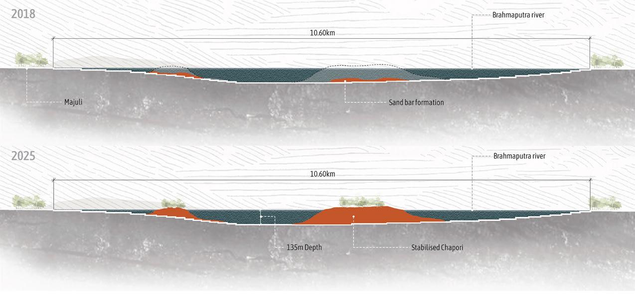 This dissertation proposes a strategic built environment composed of a stiltbased housing network designed to guide river sedimentation over time. By enabling the formation of artificial sand bars, this approach aims to support permanent housing and sustain local livelihoods through stabilized land for economic activities. By integrating architecture with land, water, and people, the project offers a spatial strategy that moves in rhythm with the river Brahmaputra, fostering resilience and continuity in the face of ecological uncertainty.