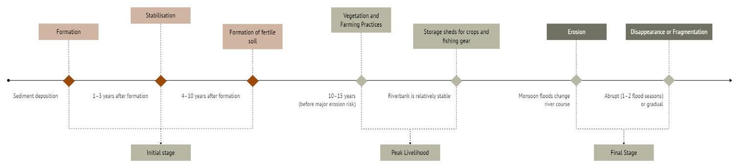 • Chapori Growth Thresholds: Stabilisation predicted based on vegetation presence, sediment load accumulation (>1.2m), and seasonal flooding exposure.