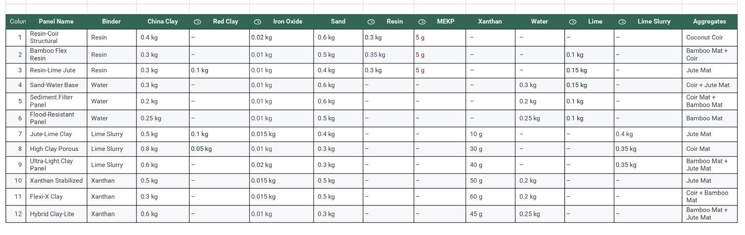 - Water or lime-slurry panels (Sand–Water Base, Sediment Filter Panel, Flood Resistant Panel, Jute–Lime Clay, High Clay Porous, Ultra-Light Clay Panel),