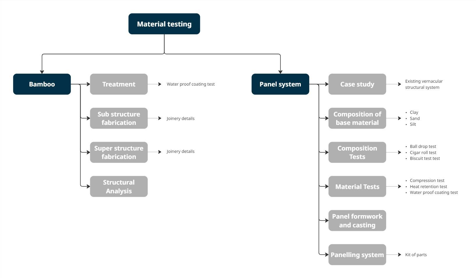 This table presents the material experimentation matrix developed to test a range of composite panel prototypes by varying binders and stabilizers. The intention was to balance strength, porosity, and water resistance while relying on locally available resources.