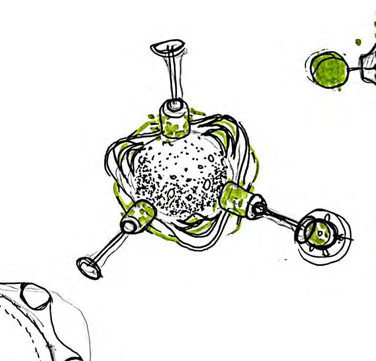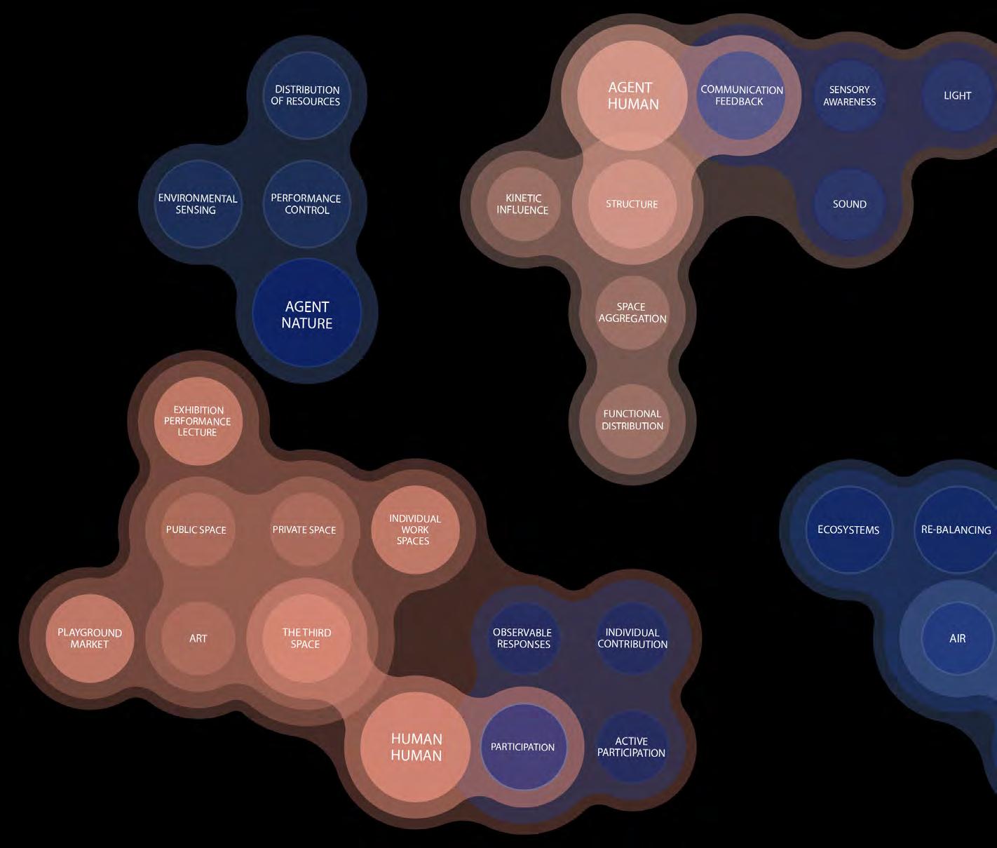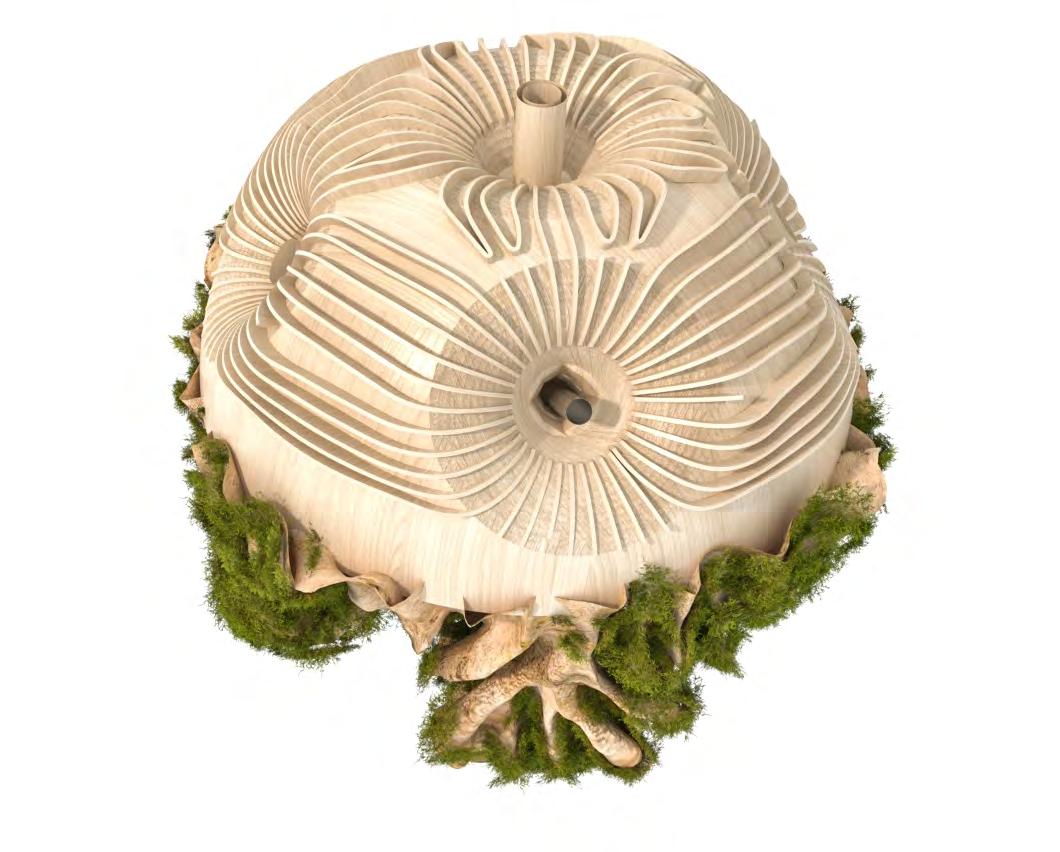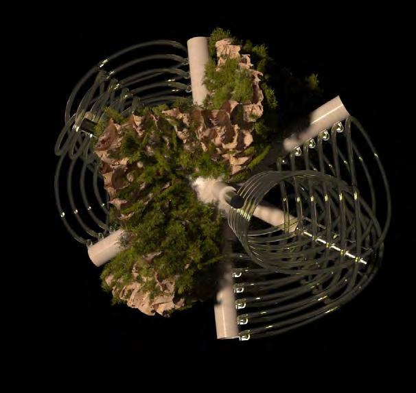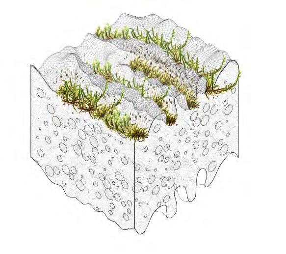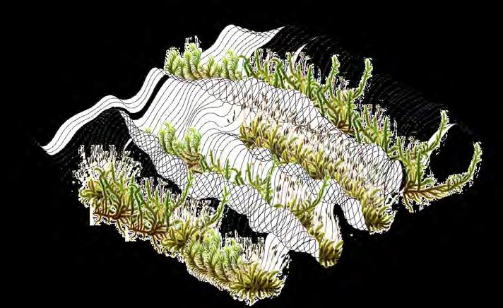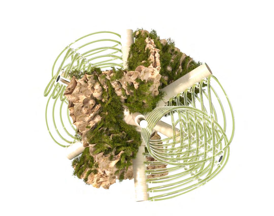 This lack of awareness in ‘eco friendly’ carbon-absorbing materials used in the building industry has not been explored to sustain species within ecosystems- never having been conceived or manufactured to facilitate coexistence. “Pattern formation mechanisms play a critical role in organism development and survival, from embryonic development to the growth and maintenance of the organism.”2 Hence, it is important to prioritise that the growth of the system should be indicative of the biological growth of the materials implemented in order to inhibit the tendencies of containing nature; creating a suitable context for coexistence and interaction between human participants and non-human species. Therefore, “conversational partnering can manifest in the form of dynamic and intuitive relationships between the environment, active observers and performers within the system. This form of interaction constructs a framework to explore space as a model of interfacing that shifts the tendencies of passive occupancy of space towards an active and evolving ecology of interacting objects.”3 Thus, the engagement instils a new ecological responsibility for rewilding and social activity located within the third space. To this extent, ‘rewilding’ ceases as the process of nature taking over while humans withdraw, but becomes the new possibility of technology and nature coming together in mutualism.