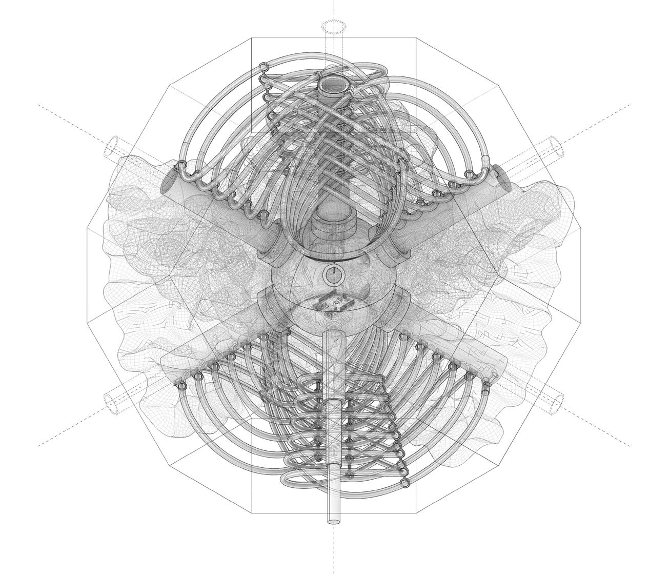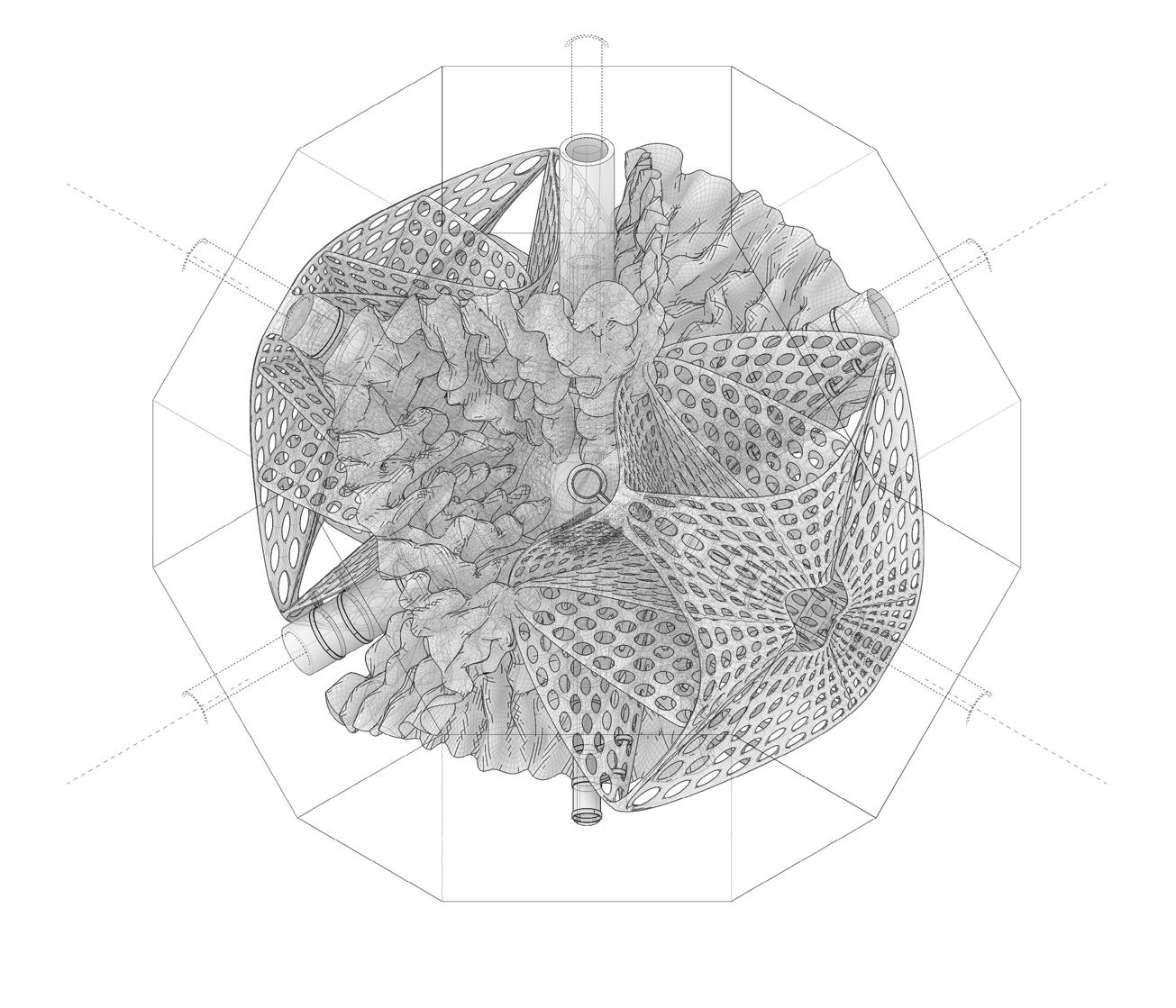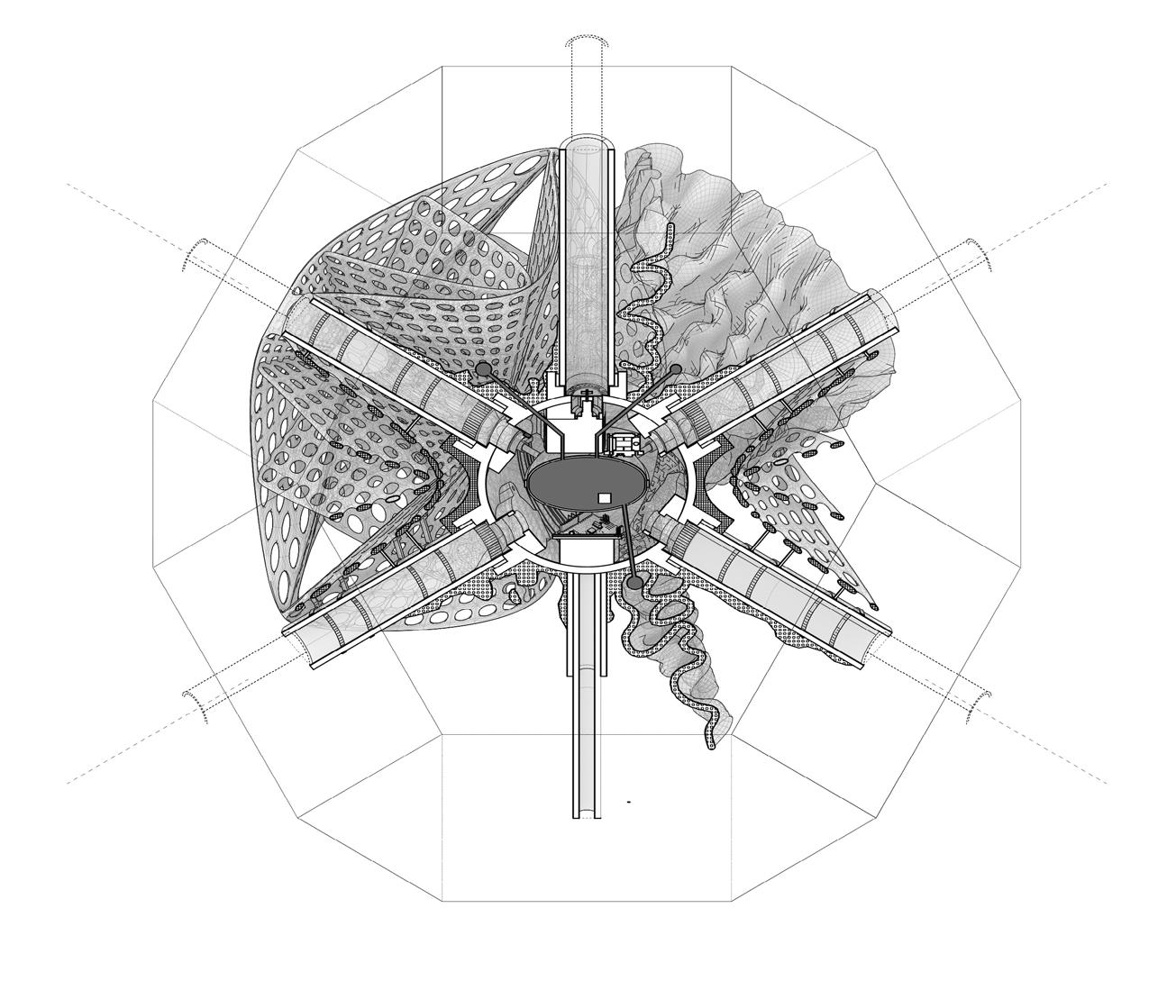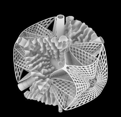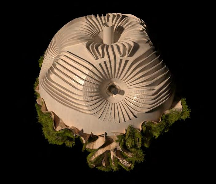 This lack of awareness in ‘eco friendly’ carbon-absorbing materials used in the building industry has not been explored to sustain species within ecosystems- never having been conceived or manufactured to facilitate coexistence. “Pattern formation mechanisms play a critical role in organism development and survival, from embryonic development to the growth and maintenance of the organism.”2 Hence, it is important to prioritise that the growth of the system should be indicative of the biological growth of the materials implemented in order to inhibit the tendencies of containing nature; creating a suitable context for coexistence and interaction between human participants and non-human species. Therefore, “conversational partnering can manifest in the form of dynamic and intuitive relationships between the environment, active observers and performers within the system. This form of interaction constructs a framework to explore space as a model of interfacing that shifts the tendencies of passive occupancy of space towards an active and evolving ecology of interacting objects.”3 Thus, the engagement instils a new ecological responsibility for rewilding and social activity located within the third space. To this extent, ‘rewilding’ ceases as the process of nature taking over while humans withdraw, but becomes the new possibility of technology and nature coming together in mutualism.
