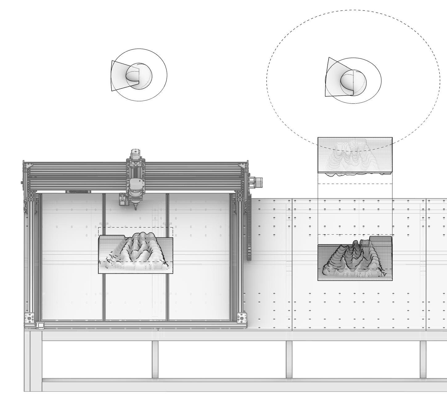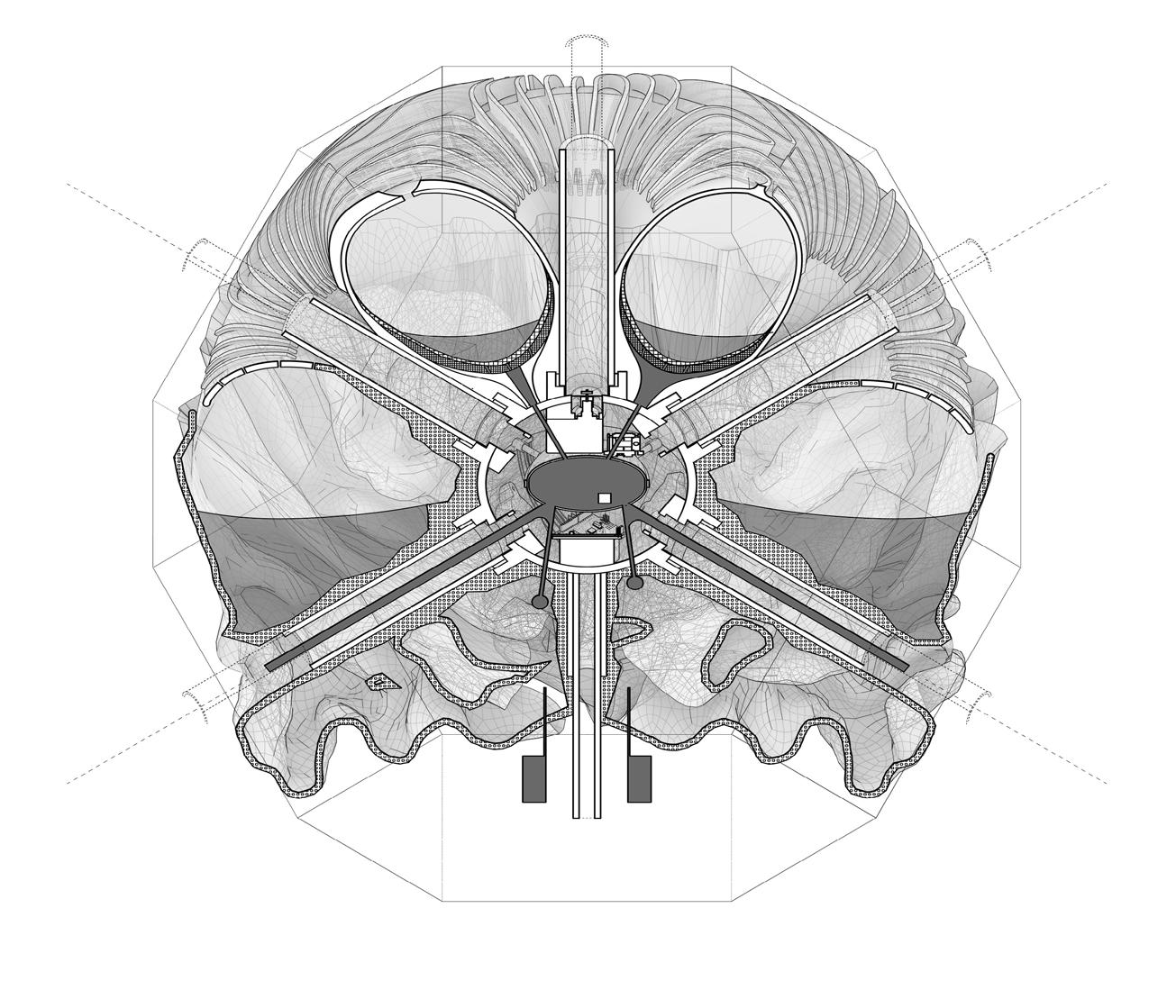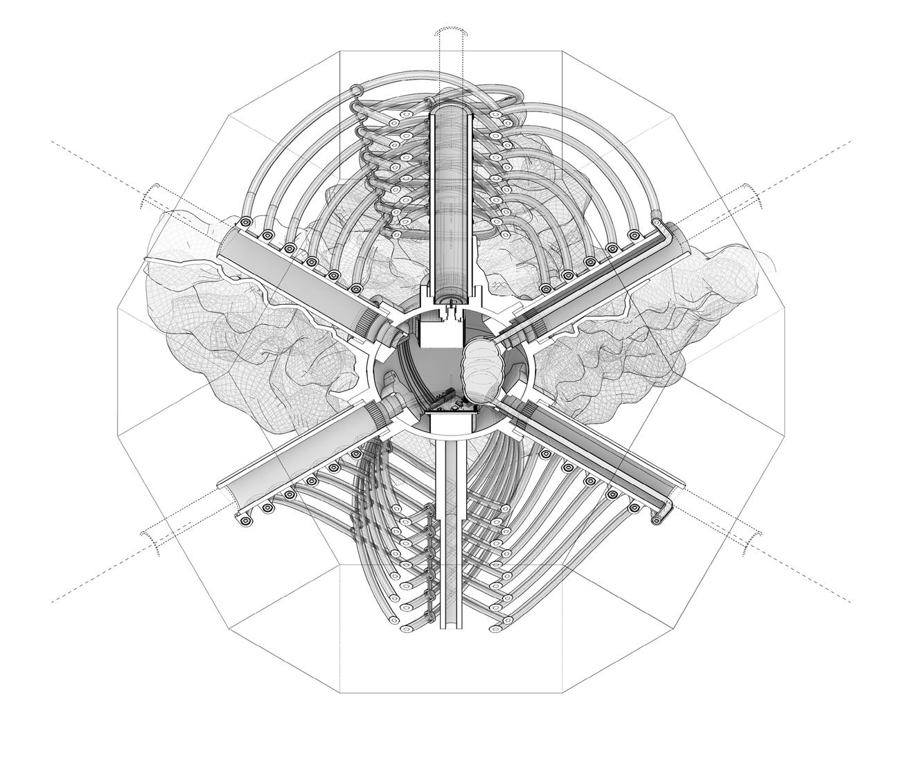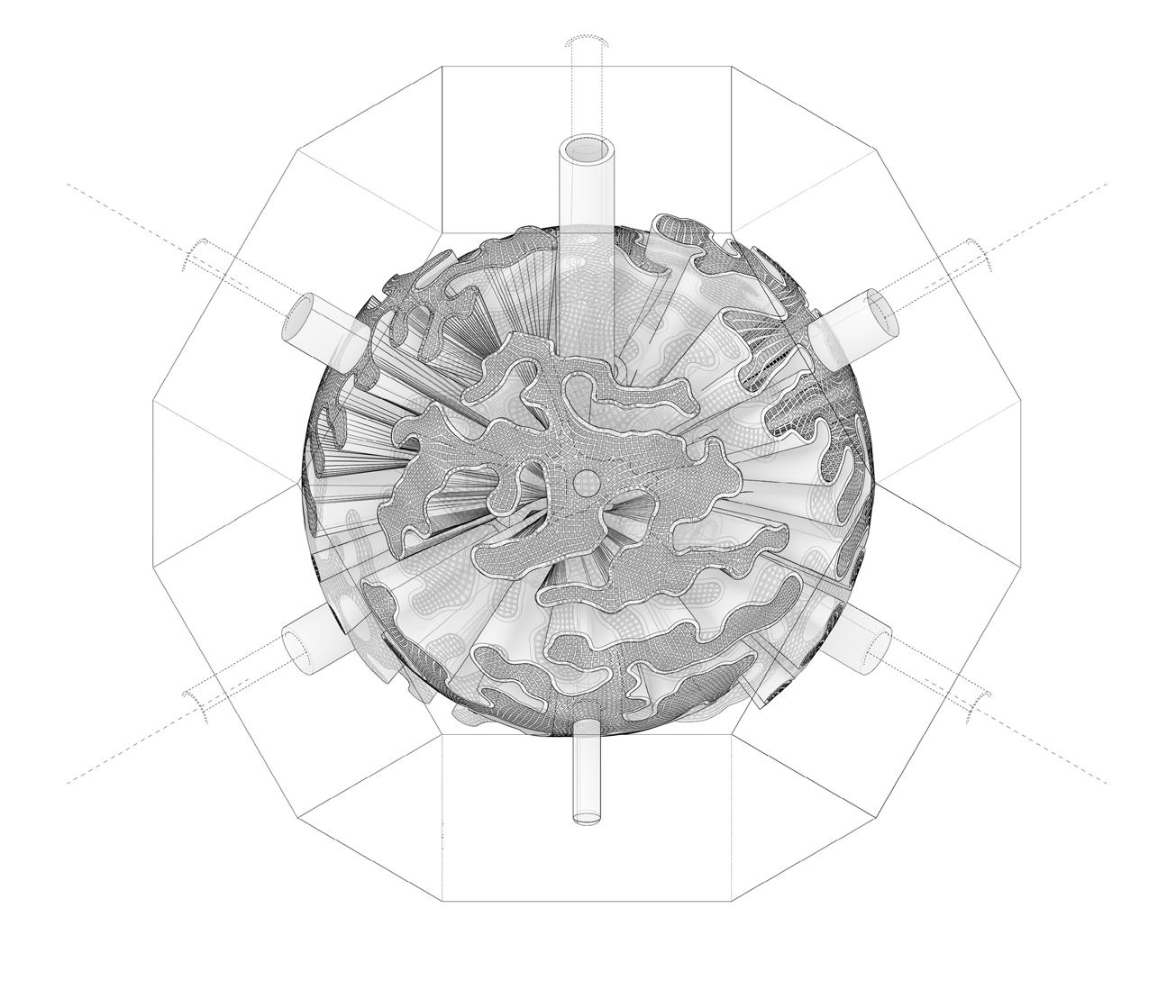 This lack of awareness in ‘eco friendly’ carbon-absorbing materials used in the building industry has not been explored to sustain species within ecosystems- never having been conceived or manufactured to facilitate coexistence. “Pattern formation mechanisms play a critical role in organism development and survival, from embryonic development to the growth and maintenance of the organism.”2 Hence, it is important to prioritise that the growth of the system should be indicative of the biological growth of the materials implemented in order to inhibit the tendencies of containing nature; creating a suitable context for coexistence and interaction between human participants and non-human species. Therefore, “conversational partnering can manifest in the form of dynamic and intuitive relationships between the environment, active observers and performers within the system. This form of interaction constructs a framework to explore space as a model of interfacing that shifts the tendencies of passive occupancy of space towards an active and evolving ecology of interacting objects.”3 Thus, the engagement instils a new ecological responsibility for rewilding and social activity located within the third space. To this extent, ‘rewilding’ ceases as the process of nature taking over while humans withdraw, but becomes the new possibility of technology and nature coming together in mutualism.