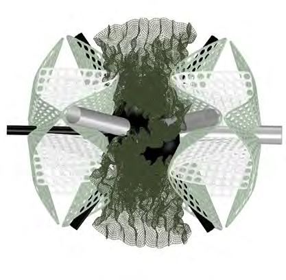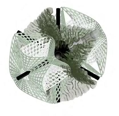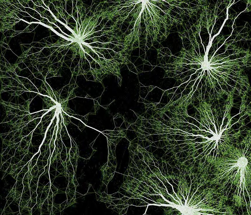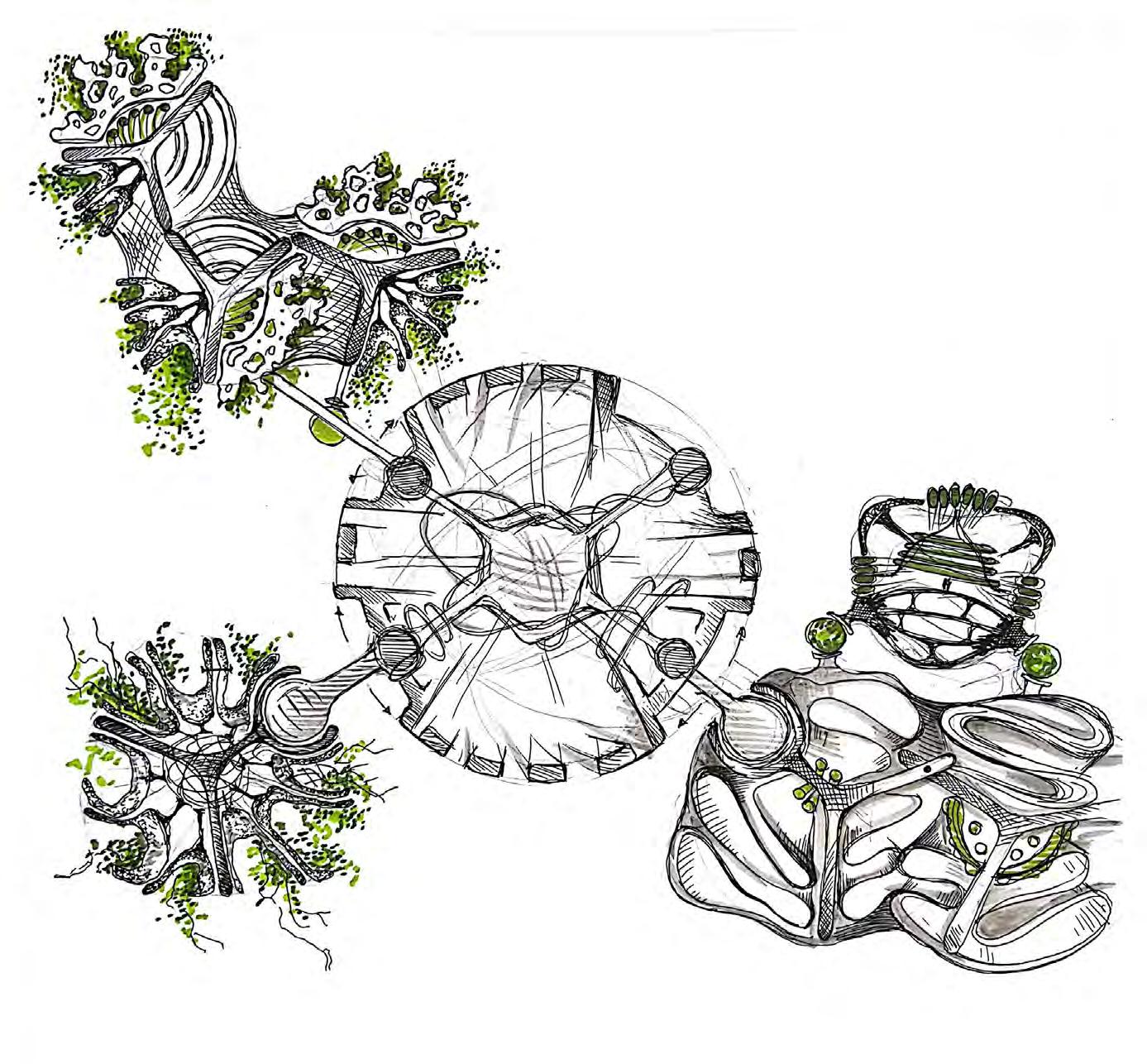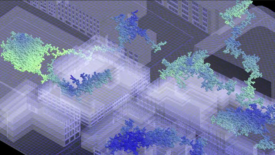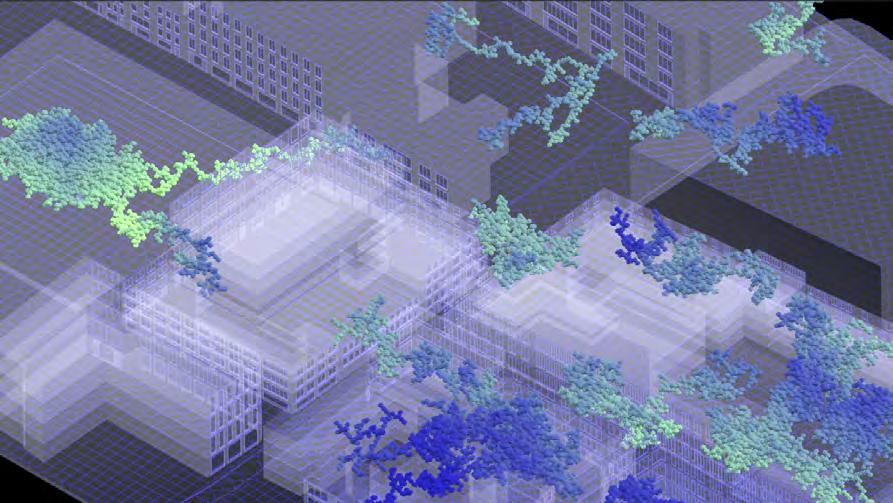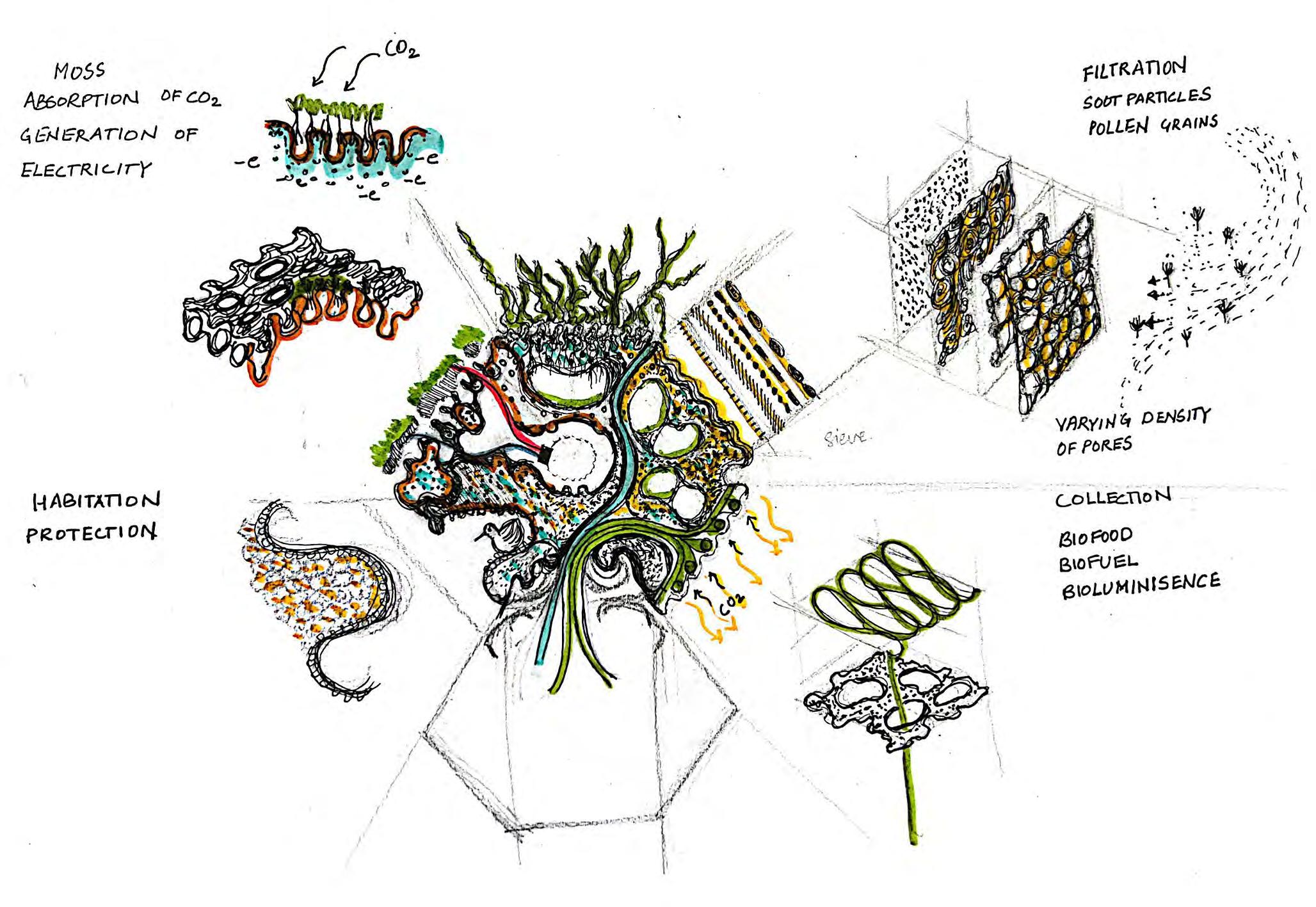 The fragmentation of the natural landscape and pollution caused by human activity accelerates the degradation of the ecosystems already hanging in precarious balance; under this domain, the research proposes a mitigating solution. The purpose of the project is to create a new green network that links existing green tissue and re-connects green spaces to London’s Green Belt. The network that has been established operates within the threshold of interstitial spaces, revitalising underutilised spaces into public spaces and enhancing the environmental conditions of existing ones. Composed of “bio-bot” modules, or ecological machine hybrids, it has a direct adaptability to be implemented in different spatial contexts, thresholds and environmental scenarios. Its migratory and transformable states of redeployment between different contexts create a participatory methodology within its functional distribution. The creation of four functional modules, for the purpose of filtration, production, collection and protection, is the emphasis of the research. Biological development of its material behaviour will be synergistic with the evolutionary design process employed to optimise morphological development of bio-bot modules while considering local environmental conditions. The system will define a new symbiotic and metabolic engagement through which the relationship between human participants and non-human species using living green tissue augments the existing environment. Implementation of constant monitoring will allow for variability of the formal organisations of the components to become new adaptive ecologies rather than infill strategies in situ.