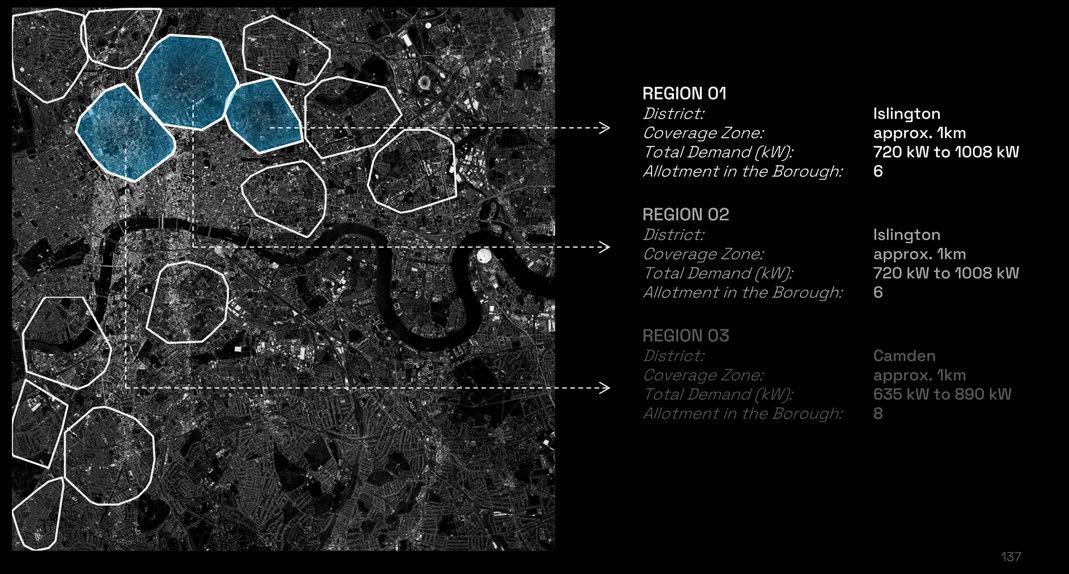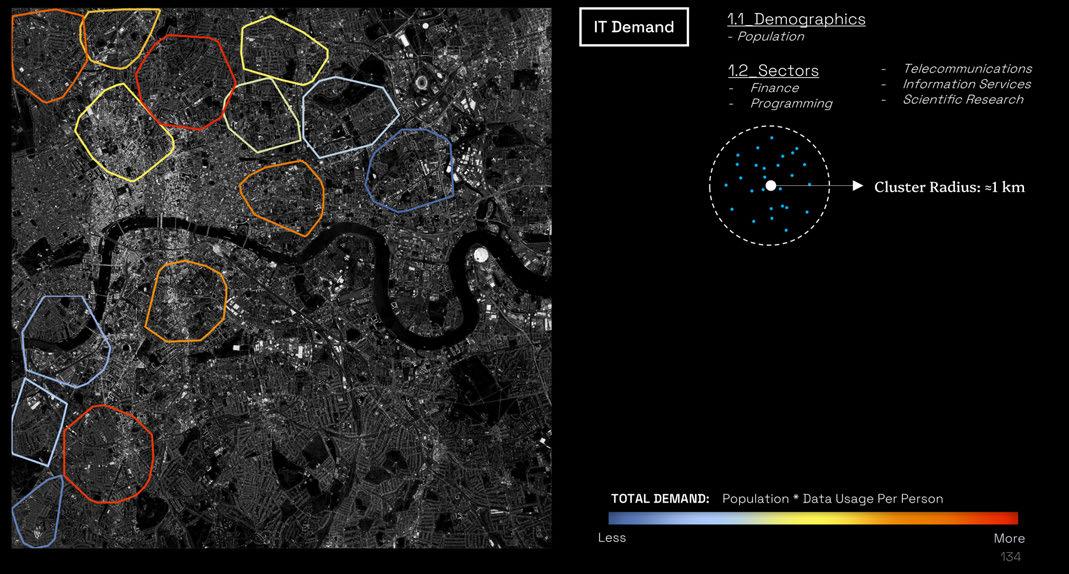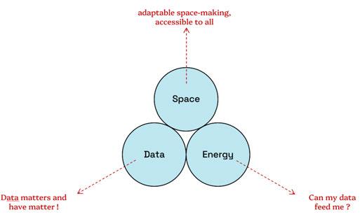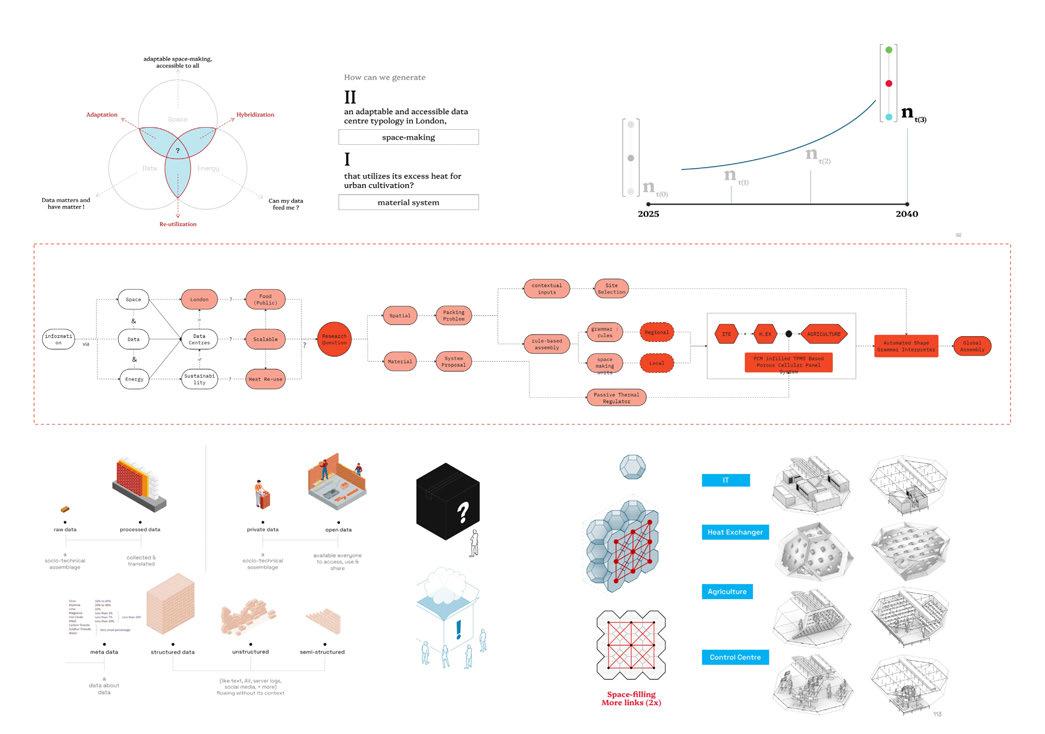 This research explores the intricate interdependence between data generation, storage, consumption, and the utilization of space and energy within the urban fabric, focusing on London’s role as a global data hub. By reimagining traditional data center typologies, the integration of these data processing facilities into the urban landscape is speculated, prompting the question, “Can the data I produce feed me?” This approach paves the way for a mutual integration of these embedded spaces with the public, through the development of a material system combined with a space-making strategy.
