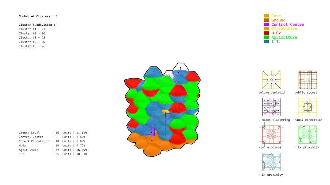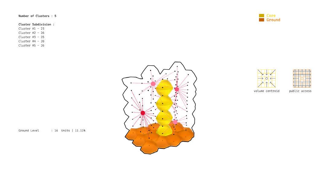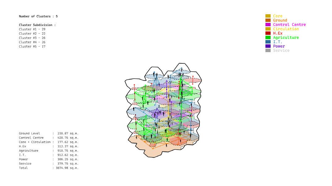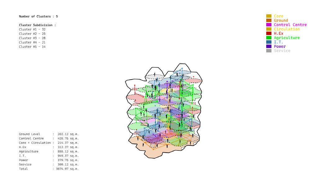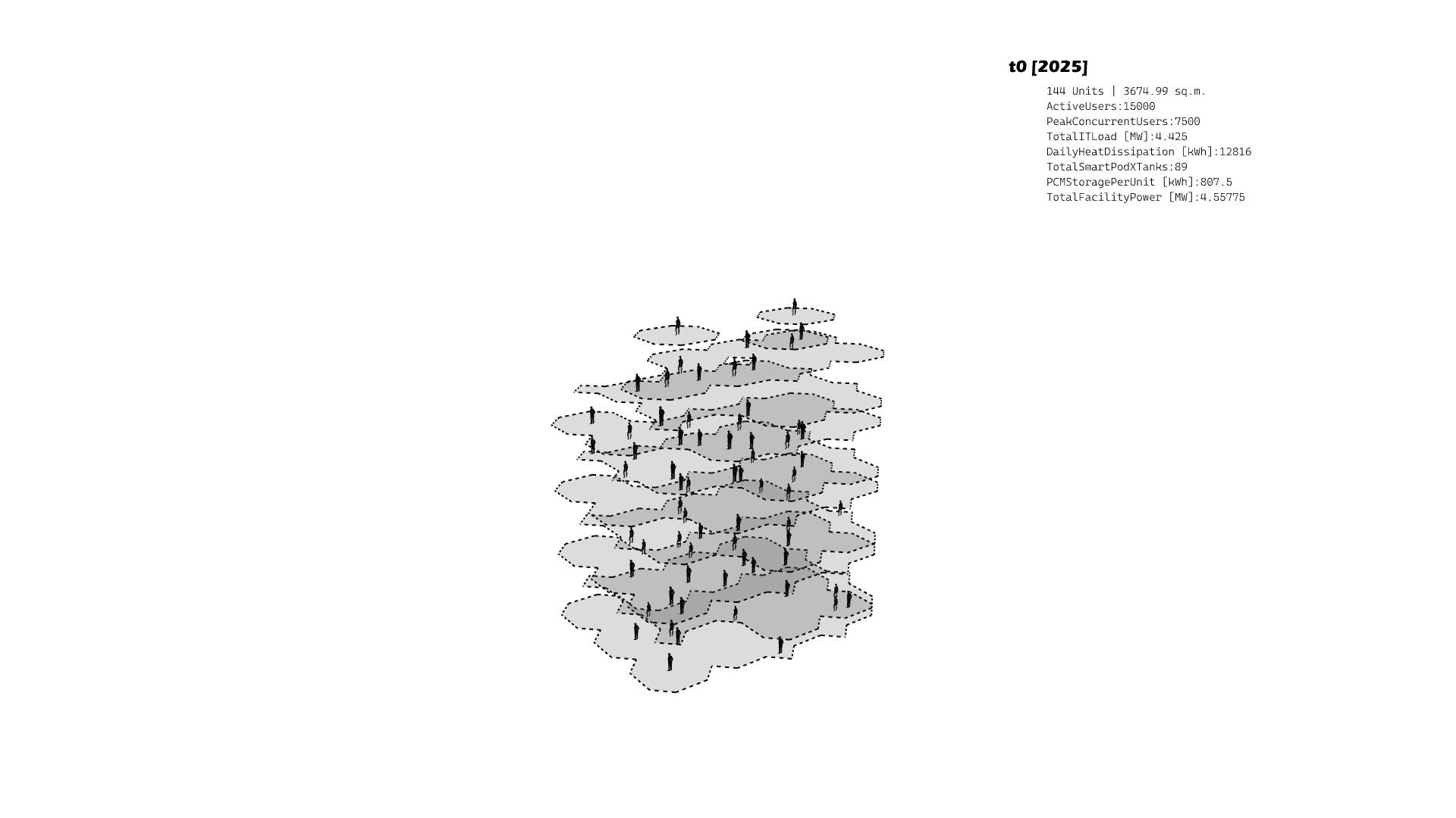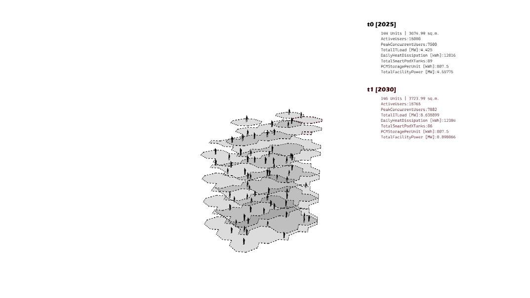 The subsequent (M.Arch) phase examines space-making experiments via an automated assembly interpreter to optimize both functional and spatial distribution. Based on contextoriented demographic data, projected computational supply-demand trends, and material system metrics, the capacity calculations determine what and how much to build from 2025 to 2040. Additionally, contextual influences derived from the immediate built environment are integrated into the site-specific vector field optimization, answering where to build. These parameters ultimately inform a semi-modular building strategy, mediating between modularity and permanence for the required spatio-temporal flexibility. Enabled by the initial phase, the topological relationships among spatial nodes are optimized for improved functional distribution and clustering according to function-targeted fitness criteria, further influencing the architectonic element configuration. The resulting space-making framework, developed through successive multi-objective optimization cycles to enhance environmental, structural, and functional performance, is tested across multiple sites, highlighting its adaptability.