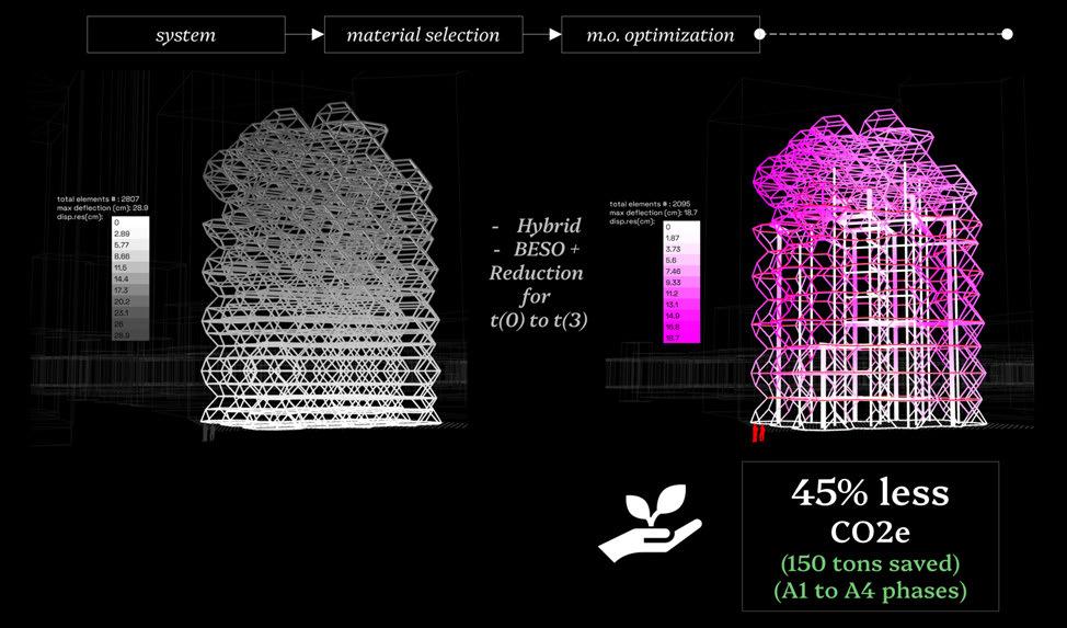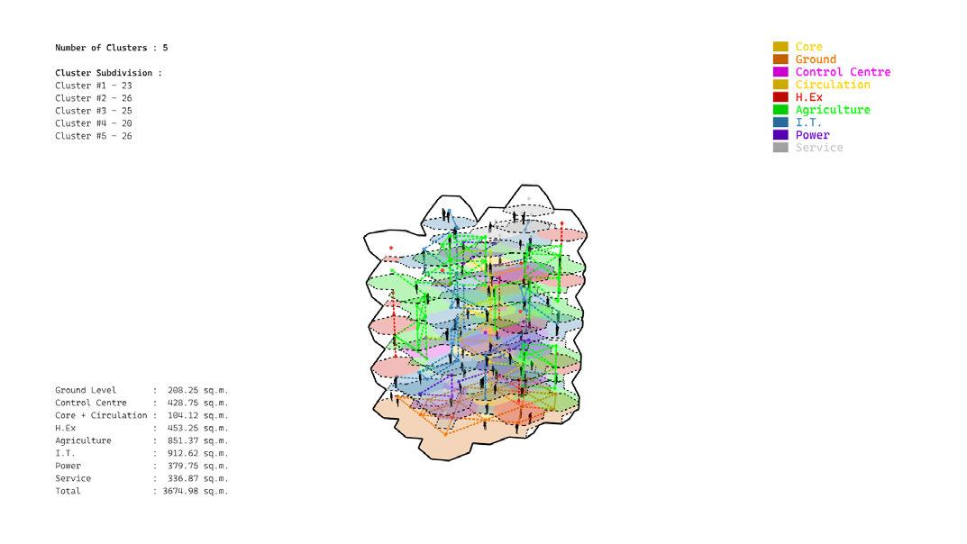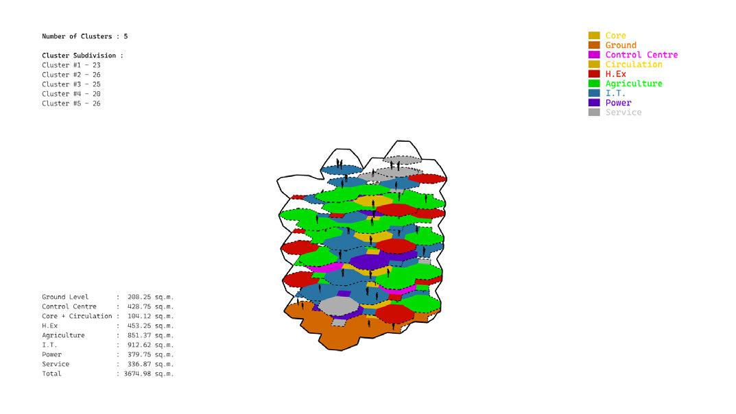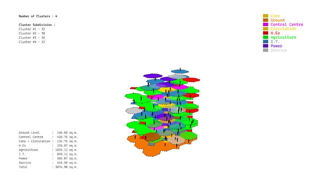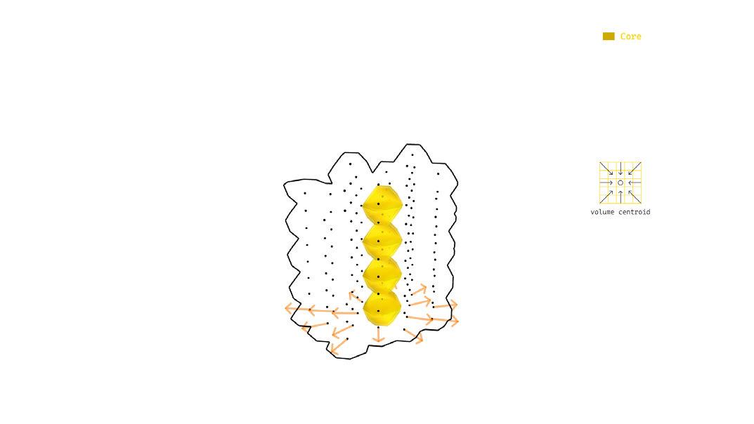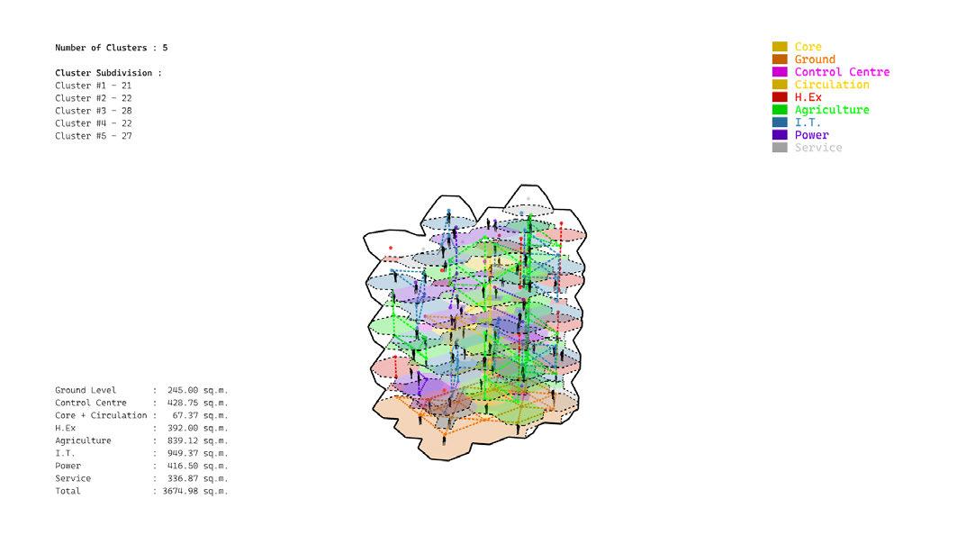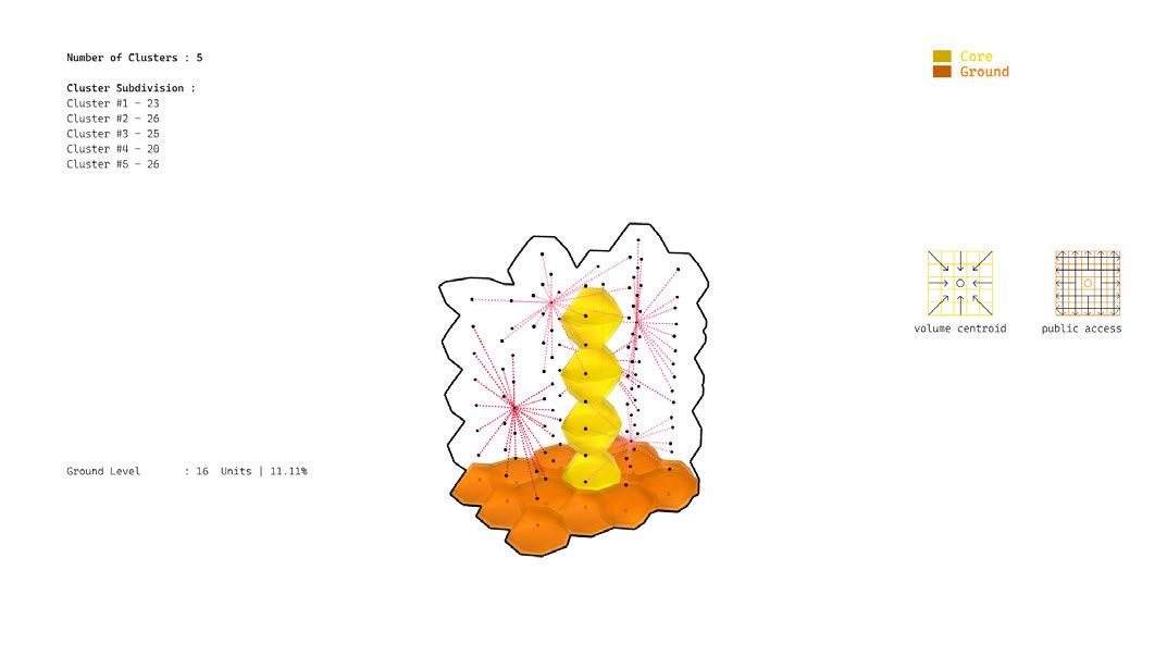 The subsequent (M.Arch) phase examines space-making experiments via an automated assembly interpreter to optimize both functional and spatial distribution. Based on contextoriented demographic data, projected computational supply-demand trends, and material system metrics, the capacity calculations determine what and how much to build from 2025 to 2040. Additionally, contextual influences derived from the immediate built environment are integrated into the site-specific vector field optimization, answering where to build. These parameters ultimately inform a semi-modular building strategy, mediating between modularity and permanence for the required spatio-temporal flexibility. Enabled by the initial phase, the topological relationships among spatial nodes are optimized for improved functional distribution and clustering according to function-targeted fitness criteria, further influencing the architectonic element configuration. The resulting space-making framework, developed through successive multi-objective optimization cycles to enhance environmental, structural, and functional performance, is tested across multiple sites, highlighting its adaptability.