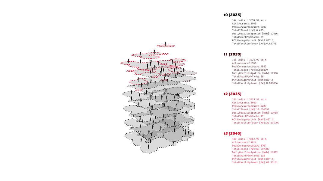 These parallel sets of experiments ensured a dynamic set of spectra to enhance the building performance and spatial qualities for adaptability and responsiveness to the ever-changing demands of data, space, and energy. The re-positioning of data centres in the urban fabric, through a re-imagined typology, aims to transform today’s unwieldy and isolated facilities into tomorrow’s integral components of the urban ecosystems.