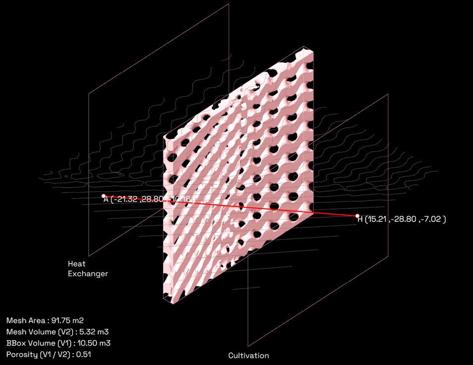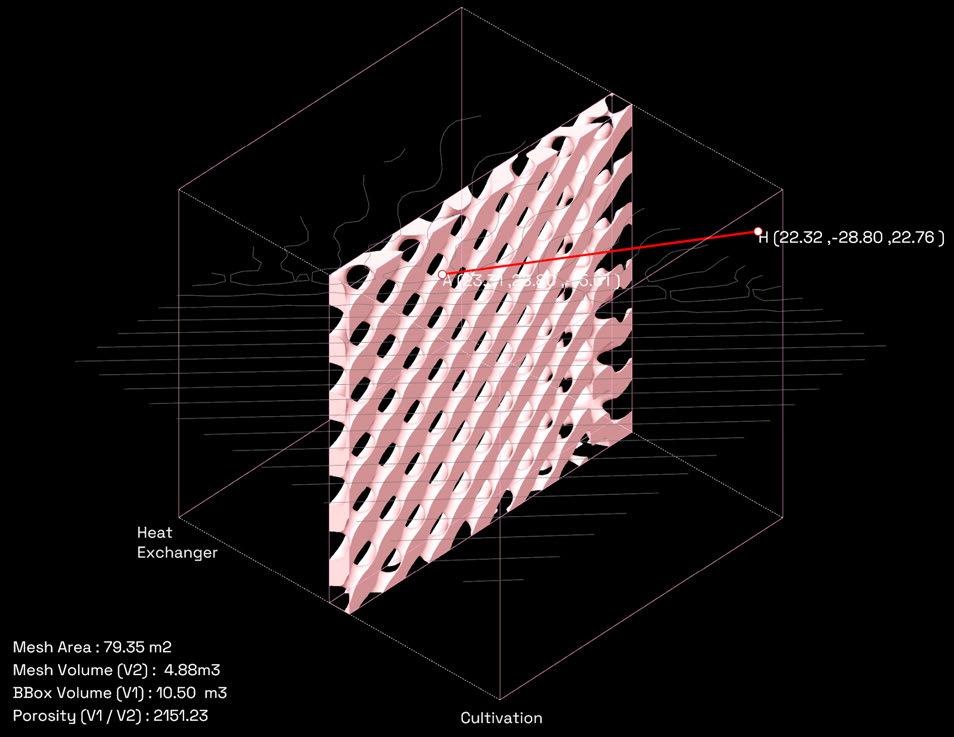 The spatial qualities of interior programs differ in volume, area, and degree of connectivity, further underscored by distinct access levels. In particular, the panel surfaces adjacent to the cultivation zones reinforce their relationship with the functions enabling agriculture. For instance, the proposed material system— TPMS-based, PCM-infilled panels— passively stabilizes internal thermal conditions while visually reflecting the level of computation activity through its varying transparency. (More computation increases heat storage, transitioning the material to a liquid and becoming transparent; reduced computation allows the release of heat, reverting it to a solid, opaque state.)