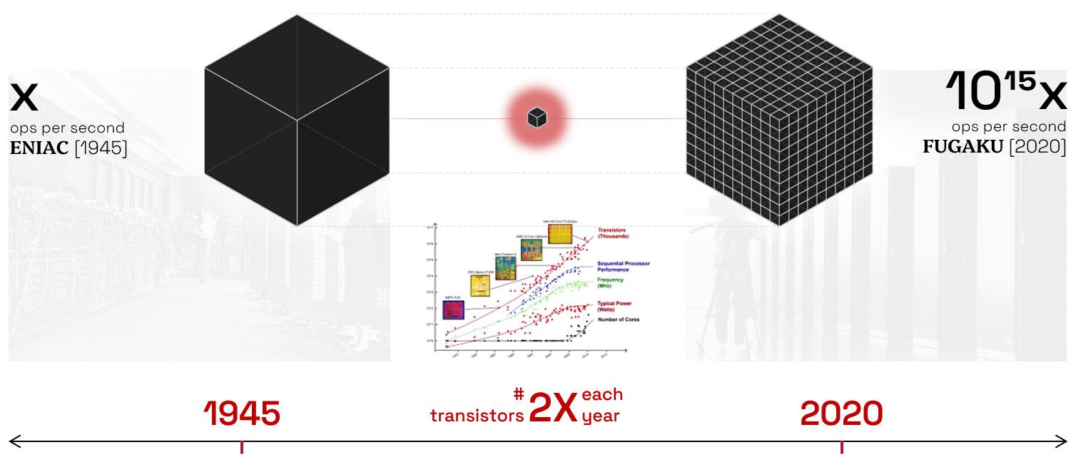 The past decades saw a relentless drive towards “miniaturization”, as per Moore’s Law. In the 1960s, Gordon Moore hypothesizes that the number of transistors on a microchip would double roughly every two years, leading to exponential increases in computing power.9 This prediction has largely held, propelling us into an era where billions of transistors can be integrated onto chips smaller than a fingernail. For example, the Intel 4004, introduced in 1971, was the world’s first microprocessor, containing 2,300 transistors and executing around 92,000 operations per second. In contrast, modern processors consist of 16 billion transistors and perform trillions of operations per second. This comparison illustrates the drastic advancements in processing power and efficiency over the past few decades. Despite the tremendous progress achieved through miniaturization, the pursuit of more powerful and efficient processors persists.
