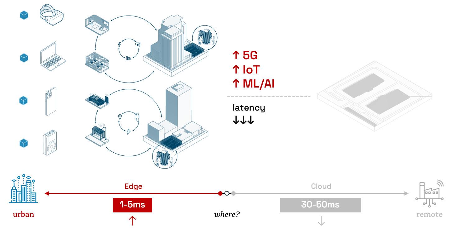 The data journey begins with connected devices such as smartphones and smart cars. Initially, this data are sent to edge data centres These facilities are smaller and decentralized.10 Located close to end-users, they are positioned in the urban fabric to minimize latency and improve data processing speed.