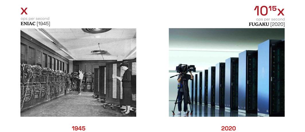 [Fig. 09] Data processing apparatuses comparison, the first and the most up-to-date computer (images retrieved from https://penntoday. upenn.edu/news/worlds-first-general-purpose-computer-turns-75/ (left) and https://japan-forward.com/a-look-at-the-magic-behindfugaku-the-worlds-leading-supercomputer/ (right).