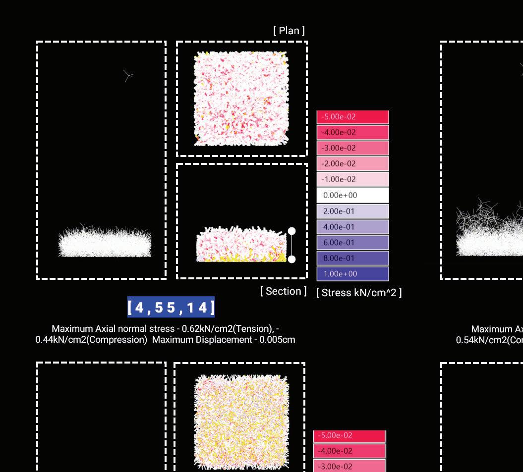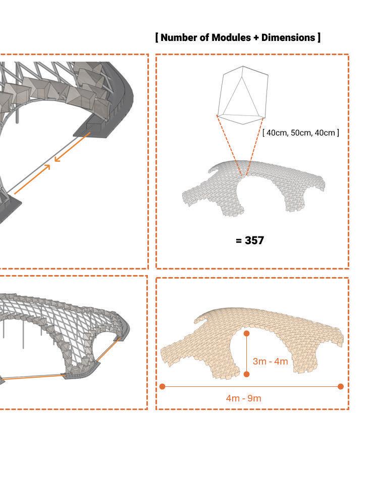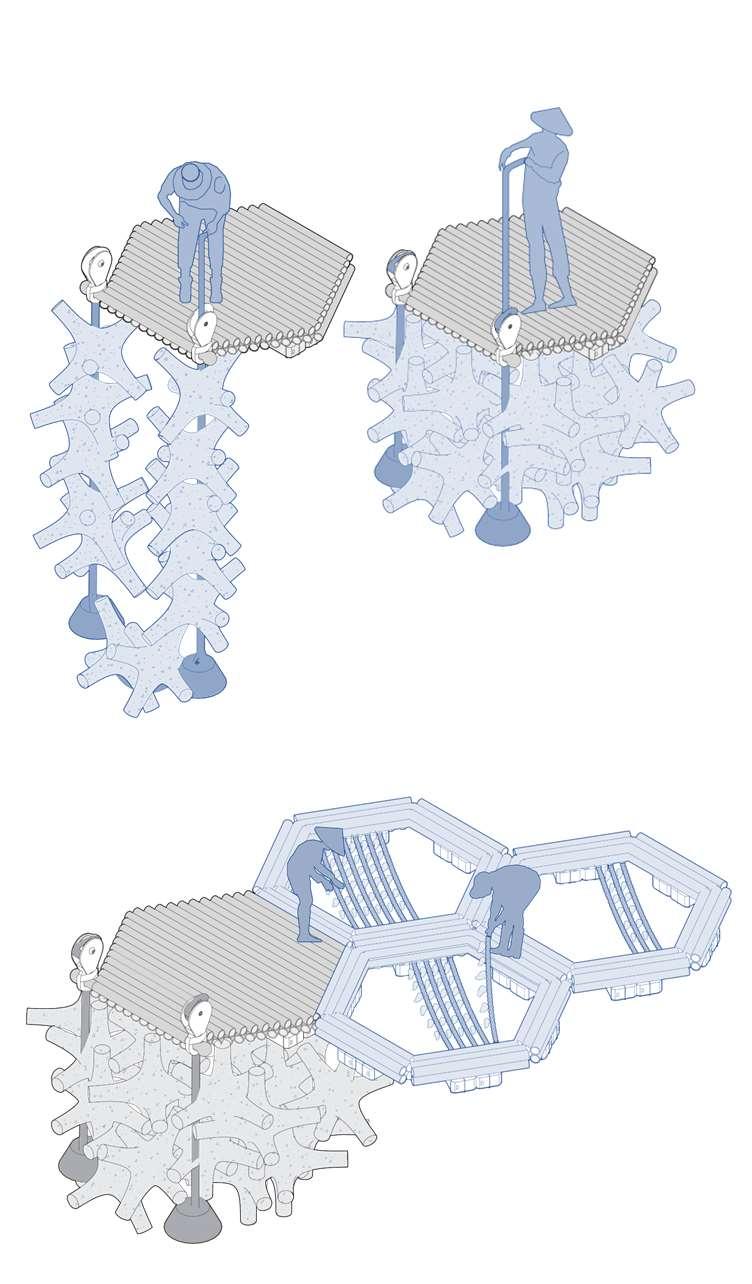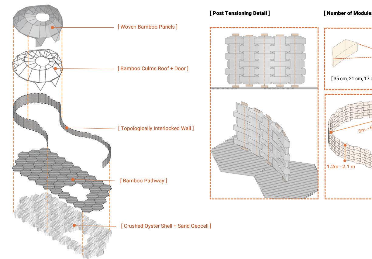 The material assemblies also invite critique.The geocell-sand-shell composites and the posttensioned bamboo structures are inventive, but they raise questions of craft and labor. How would these systems be assembled by fishermen with limited resources, and what forms of knowledge transfer are assumed? The lightweight tectonics of bamboo panels and falsework appear convincing on paper,