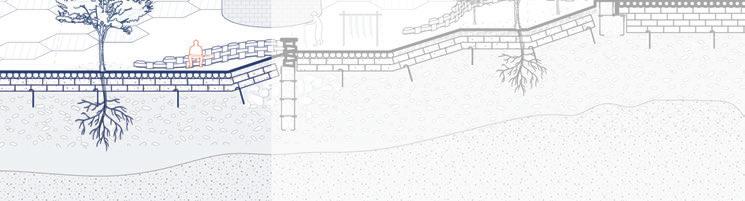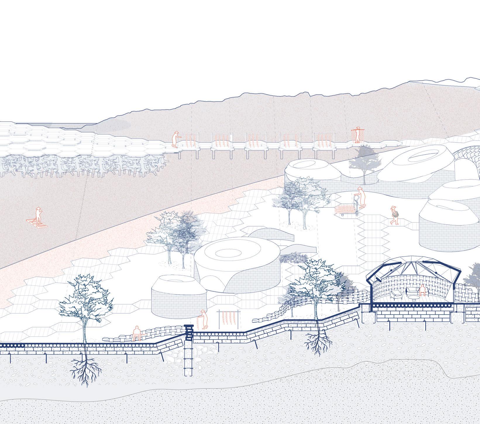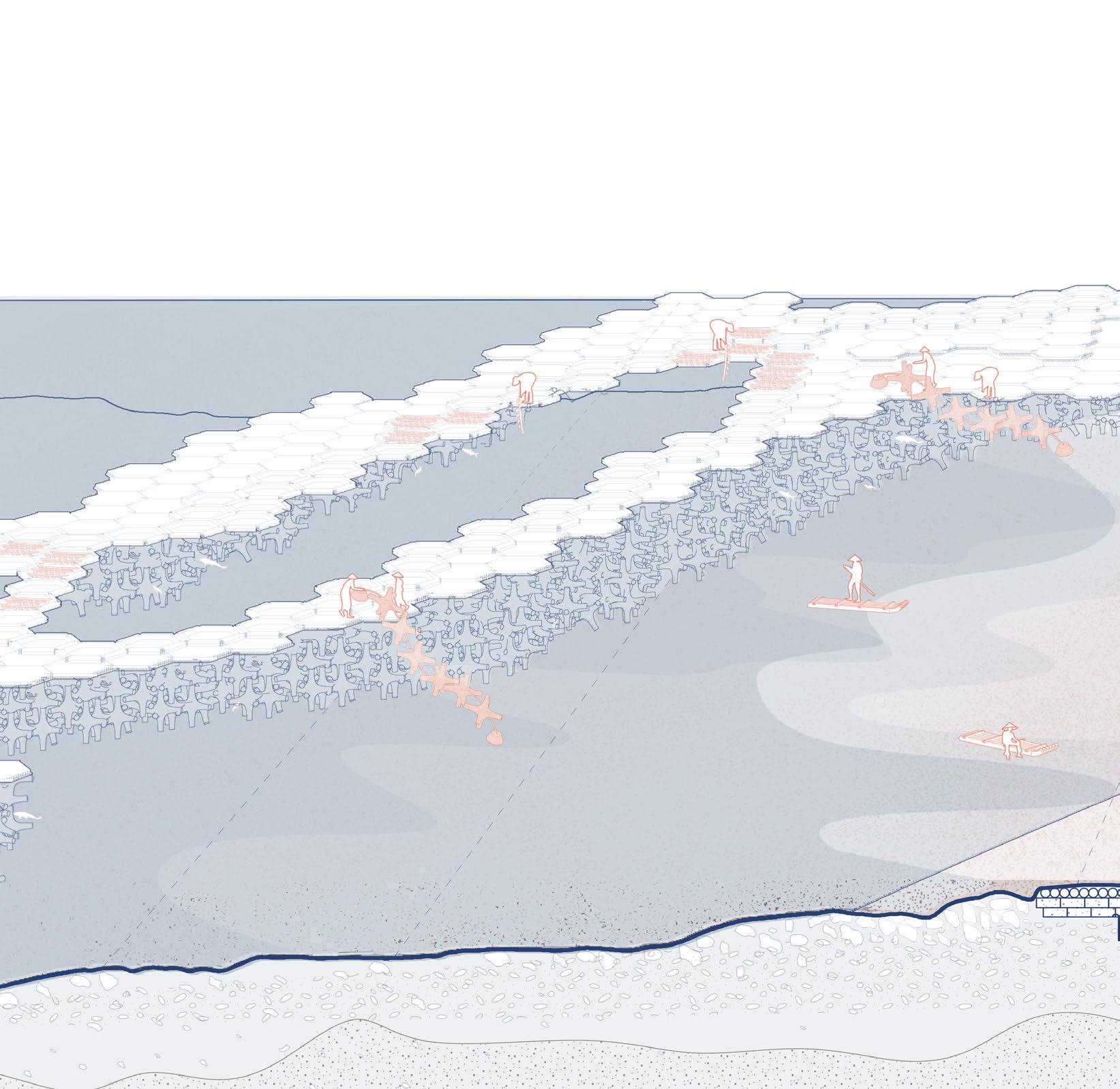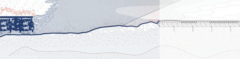 The section captures a gradient of activities that transition from o shore interventions to on-shore production and habitation. It begins with deploying obstacle modules in the tidal zone, which act as ecological anchors—slowing currents, stabilizing sediments, and creating conditions for marine growth. On these stabilized grounds, oyster farming takes place, with farmers cultivating spat across modular decks designed for access and maintenance.