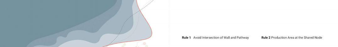 From this fixed geometry, Phase 01 sets up the land-growing and hatchery platform, serving both ecological and infrastructural roles. In Phase 02, the focus shifts to broader spatial distribution for around 150 people, laying out zoning logics that di erentiate between residential and productive areas. Once this distribution is set, the next step is about micro-level unit detailing: orienting production unit shells to optimize environmental exposure, calibrating residential wall heights for enclosure and openness, and weaving trees and pathways into the layout to reinforce circulation.