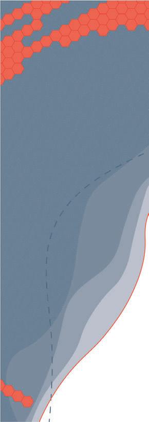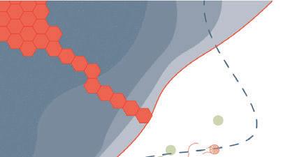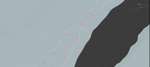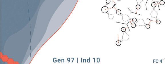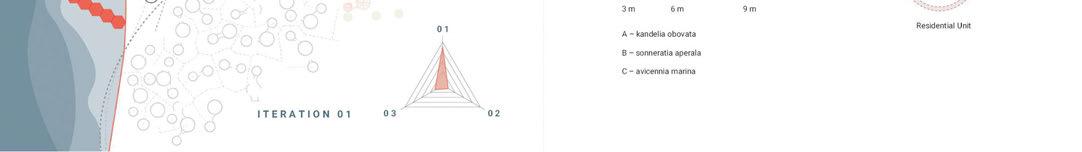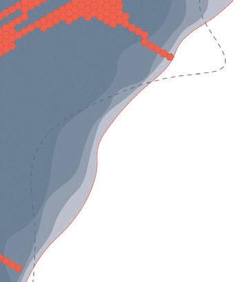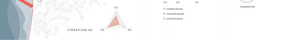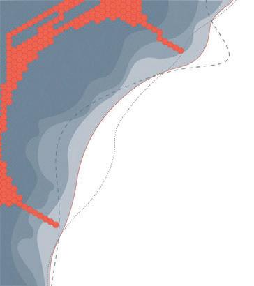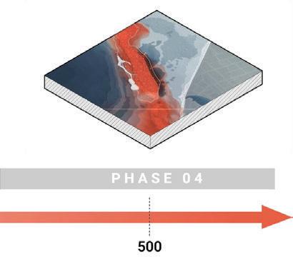 design is initiated, accommodating an initial settlement of 150 residents. The planning in this phase follows the design strategies outlined in the previous section, ensuring that the emerging urban fabric is both ecologically responsive and spatially coherent. Phase 03 marks the next step in expansion, guided by the simulation results at frame 180. By this point, further sediment build-up has created new areas of stable ground, enabling the urban structure to grow. The settlement is expanded to house 300 residents, e ectively doubling the population from the previous phase.