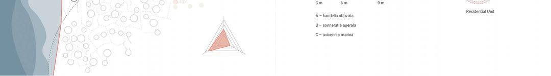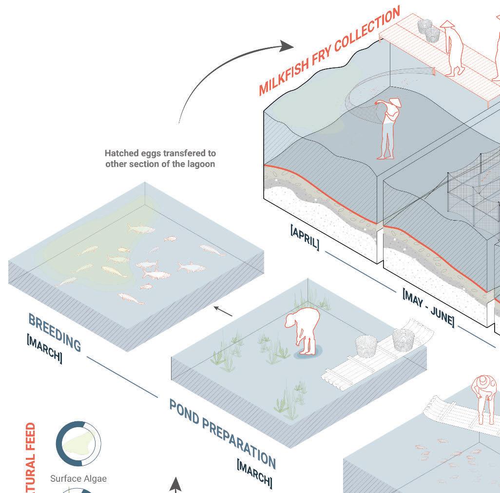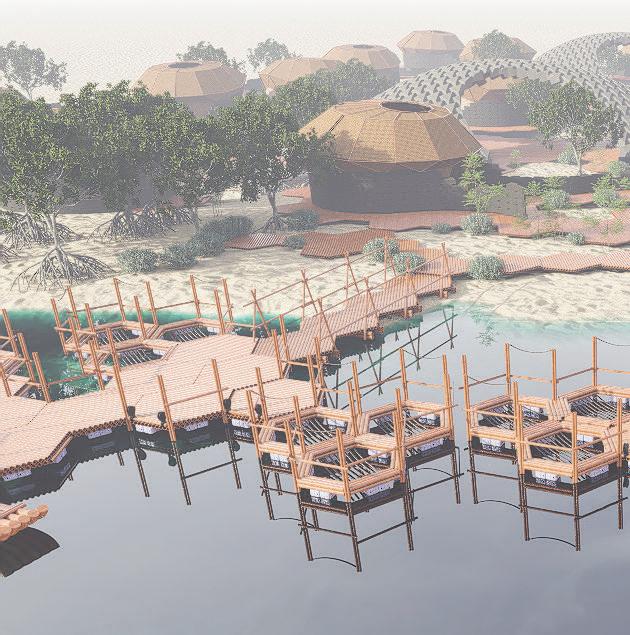 The proposal begins with an initial group of around 150 fishermen, who arrive seasonally to establish the first hatchery platforms and temporary shelters. At this stage, activity is concentrated o shore deploying obstacle modules to slow currents, cultivating oyster spat in floating nurseries, and beginning small-scale farming. These early interventions anchor the ecological system while generating the first wave of economic activity. As productivity stabilizes, the community expands to around 300 people. Transitional walkways and mid-water platforms link the hatchery to the sandbar, improving access for farming and everyday use. Oyster stringing, harvesting, and small-scale processing take shape as core livelihood practices, while bamboo-roofed shelters o er lightweight, temporary habitation.
