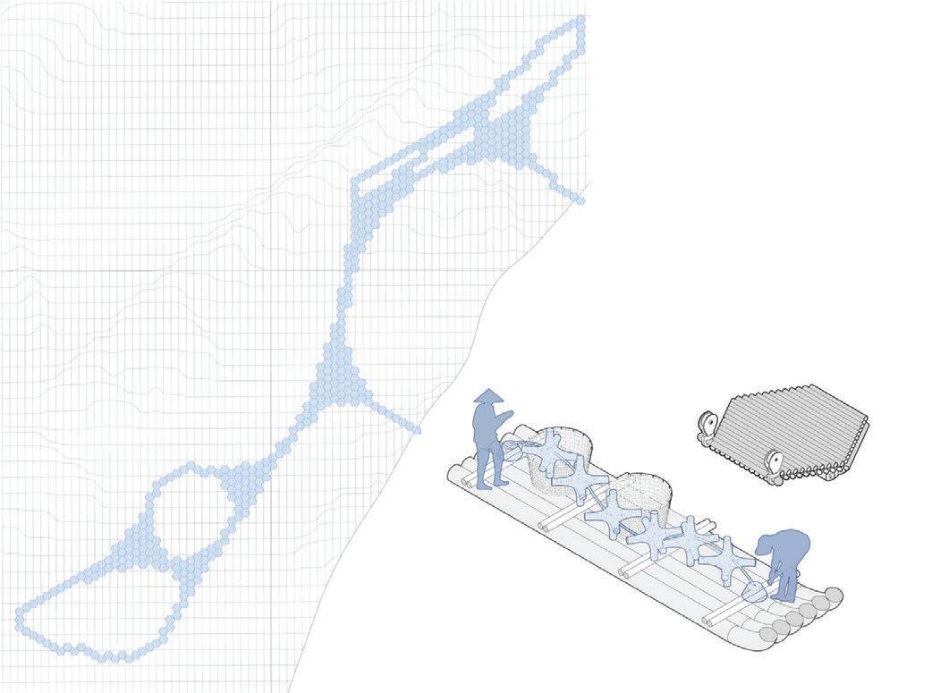 The research takes the oyster shell as its starting point. By crushing, recombining, and casting oyster shells into modular units, the research develops a composite. Deployed o shore, these modules operate through aleatory assembly, jamming and aggregating for sediment deposition. Onshore, the same modules shift into deterministic systems of topological interlocking, producing stable structures for seasonal housing, processing facilities. This continuum, from uncontrolled aggregation to controlled architecture frames the central hypothesis: that emergent interlocking systems can adapt across di erent lagoon zones.