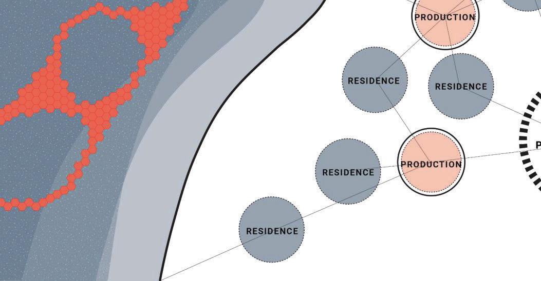 The clustering of shell units provides su cient compactness optimize land use, yet ensures that each residence maintains adequate solar access and orientation. Pathways are woven through this fabric, strengthening connectivity and linking residential areas with production and research hubs.