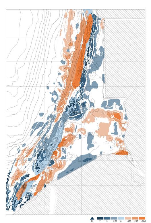 The sequential growth plan is organized into four distinct phases, each corresponding to the gradual transformation of the sandbar’s coastline as influenced by natural processes of sediment transport and deposition. Phase 01 begins with the installation of half of the hatchery platforms. These initial structures are not only intended to provide a foundation for ecological activity but also to serve as a catalyst for stabilizing the vulnerable coastline and encouraging the accumulation of sediment in targeted areas. By strategically placing only half of the platforms at this stage, the plan allows for a controlled introduction of infrastructural elements that can be monitored and adjusted as the shoreline begins to respond. Moving into Phase 02, the remaining hatchery platforms are installed, completing the full system. At this stage, the design relies heavily on the outcomes of the sediment transport simulation, particularly the conditions represented at frame 60 of the model. This snapshot of sediment accumulation becomes the baseline environmental condition for Phase 02. With this context established, the urban