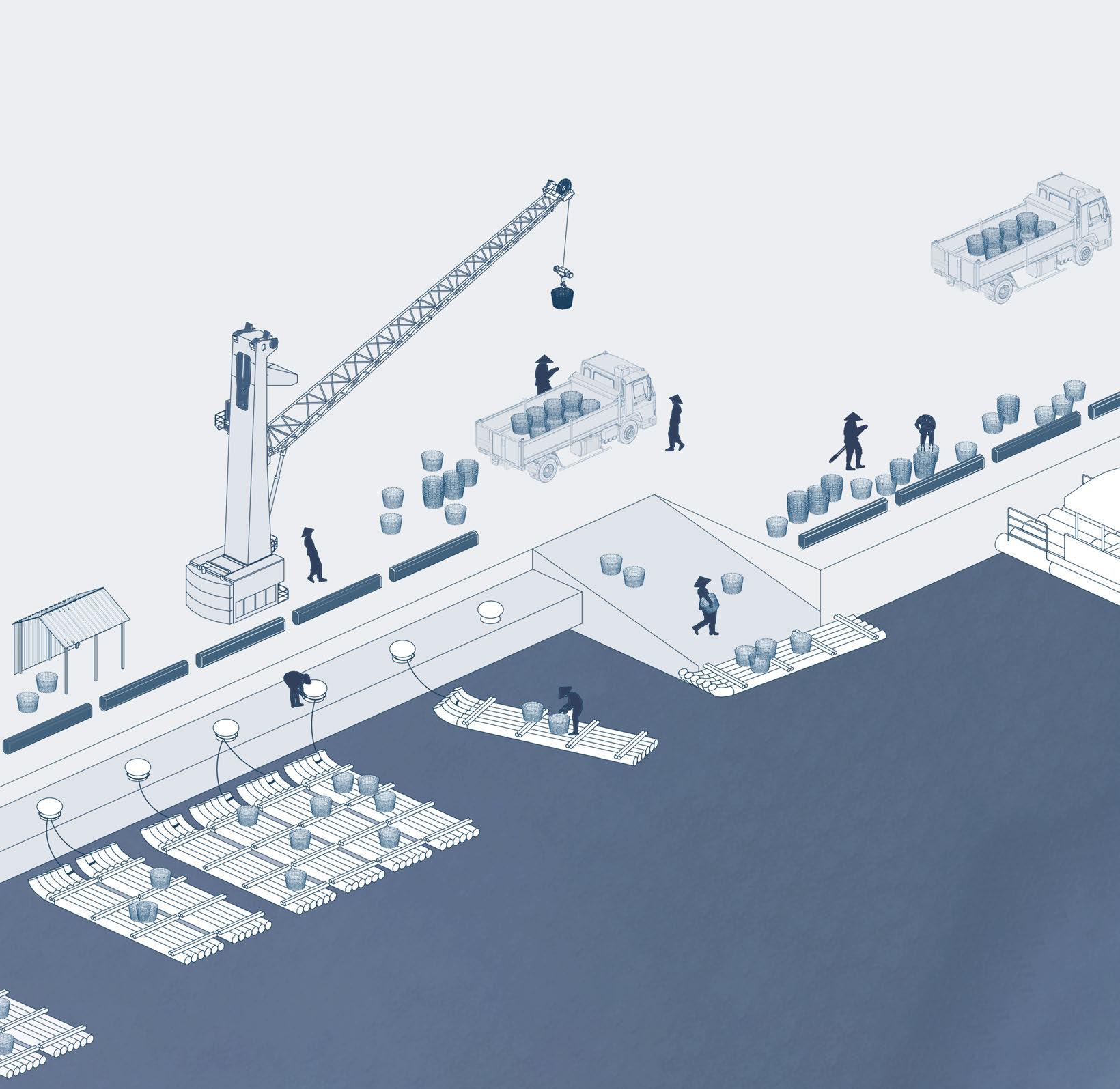 The research outcome is not a masterplan but a continuum of experiments: a horizontal gradation across o shore, nearshore, and onshore zones; a material cycle that transforms oyster shell waste into infrastructure; and architectural typologies that are adaptive, reconfigurable, and provisional.