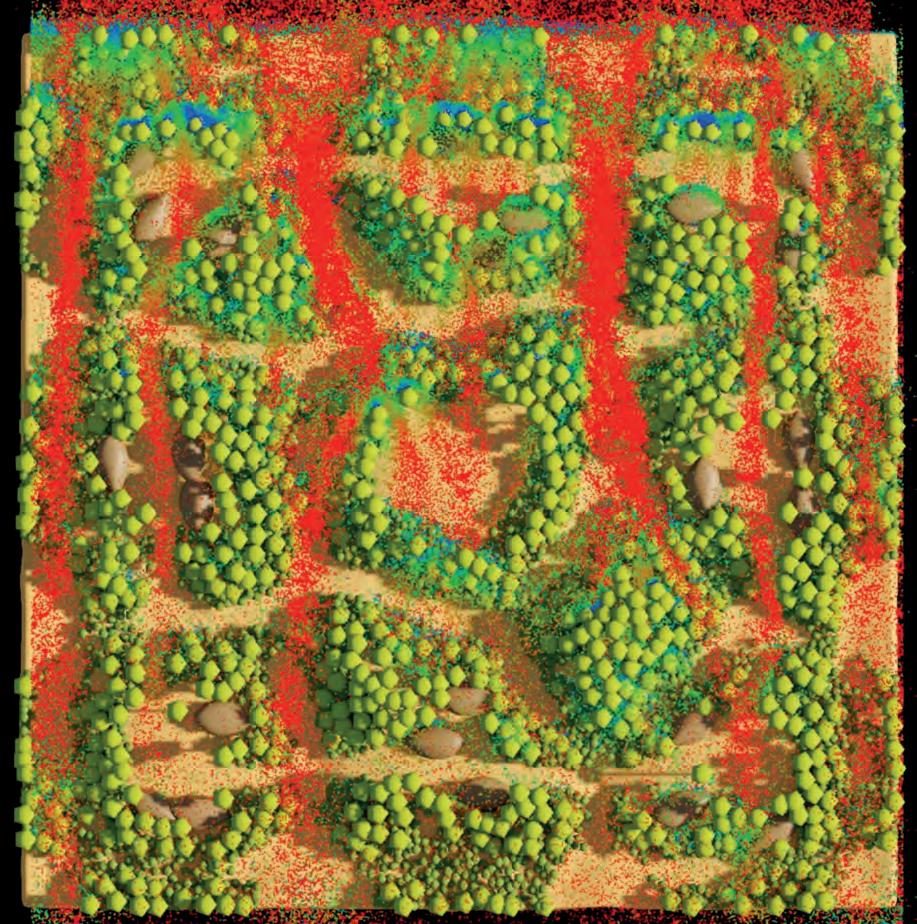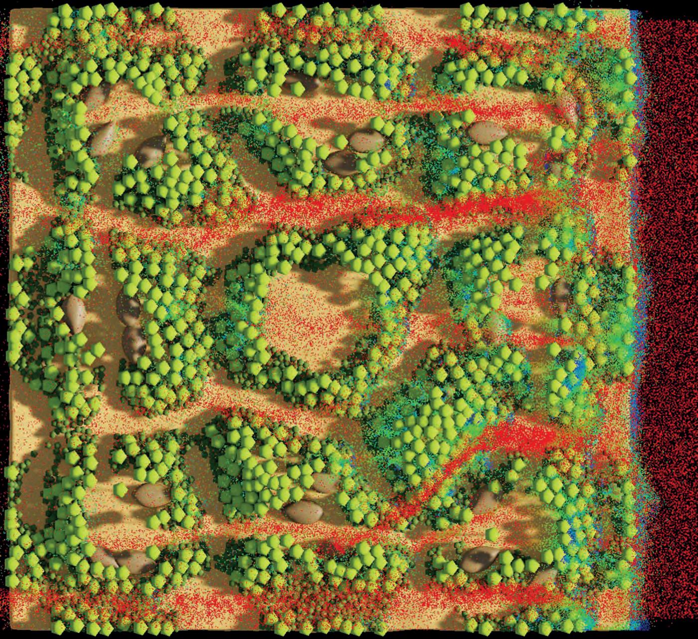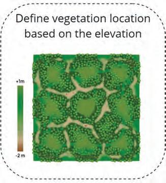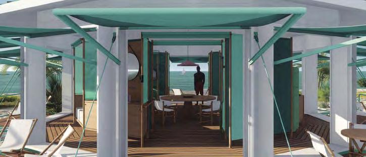 Onthelandscapeandmicro-urbanscale, abroadrangeofdigitalexperiments weredeveloped,informedbyenvironmentalandsocialresearch.Theseexperimentscomprisedare-arrangingofthe activitiesofthetraditionalplot,aflora paletteandanewwind-drivendesign landscapestrategythathavebeenimplementedtocreateasenseofcommunity, mitigatewindforcesandavoidfloods. Whiletheseexperimentsshowedpromisingresults,furtherdevelopmentonthe landscapestrategyshouldbeconducted intheMArchstage,addressingthe coastalcommunitiesmorelikelytobe damagedduringahurricane.Research regardingcoralreefsandcoastaldunes willbeconductedtoprovideasuitable solutiontomitigatehurricanedamage beforeenteringtheland.