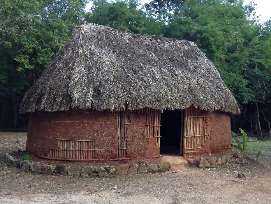 A traditional Mayan dwelling. Walls are constructed traditionally with a combination of clay and wooden sticks. The dwellings canopy is built utilising sabal palm in the palapa style with palm grown next to the dwelling.