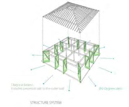 acts as a structure and a canopy system that functions as a thermal regulator for the dwelling. The canopy system is the most affected part of the Mayan house whenever a hurricane hits. The lack of material used on the canopy makes it harder for these communities to rebuild their homes after each storm; this emergency requires a tailored solution that can adapt to these coastal communities’ unique lifestyles and biome. The research focuses on the Mayan people, understanding their lifestyle, cultural and social behaviours, and studying the vernacular architecture and traditional construction techniques it employs to abstract fundamental design principles to elaborate strategies to deal with such issues.