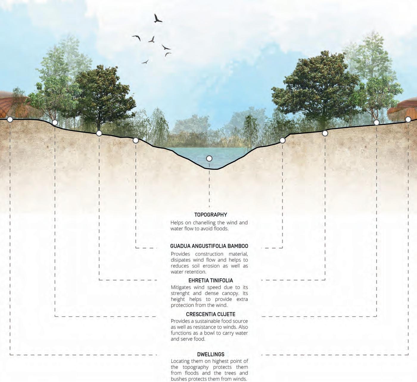 structionsystemforanewMayandwelling.Morethanredefiningthefunctional morphologies,amicro-urbandesign strategyhasbeendevelopedtoenhance economicgains,communitysense,and windmitigationcapabilitiesbyexploring landscapearchitecturepossibilities.