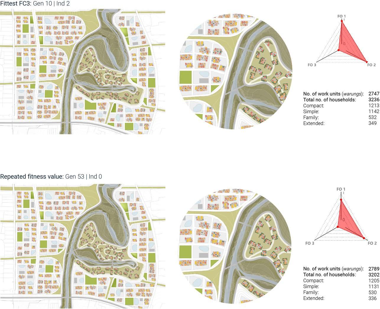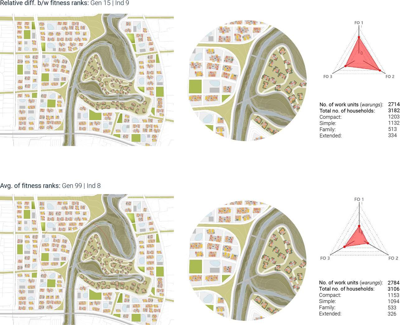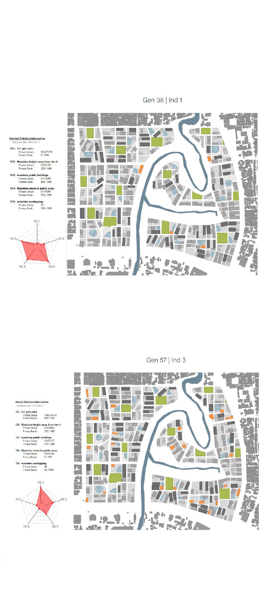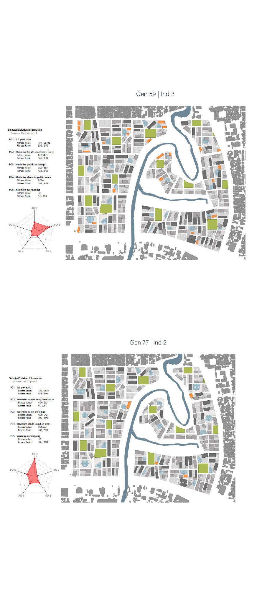 Following the individual explorations at urban and architectural scale, synthesis of the strategies was explored to allow integration of the solutions at the two scales. This was approached by experimenting with the distribution of buildings with multi objective optimisation through genetic algorithm (GA). The GA experiments considers the context of the two different types of clusters: the flood prone riparian clusters, and nonflood prone urban clusters. The outcome of the GA experiment, which is the building distribution at urban scale, were used as boundary conditions to generate individual buildings using the GA outlined in the previous section.