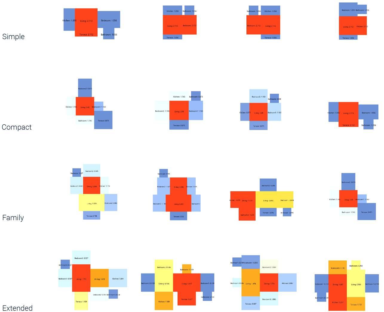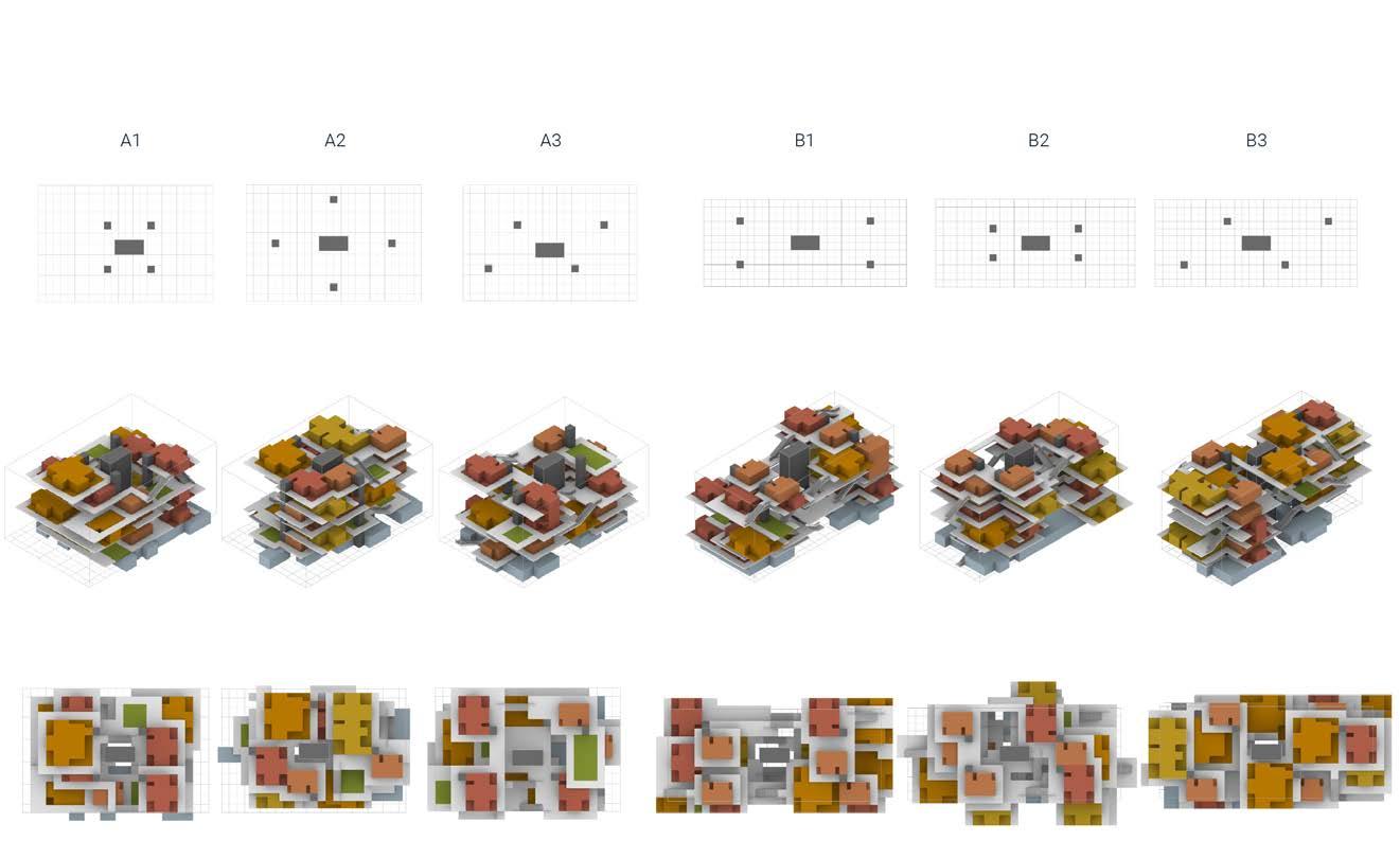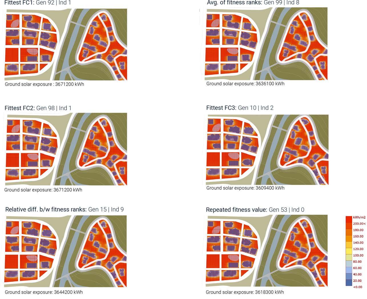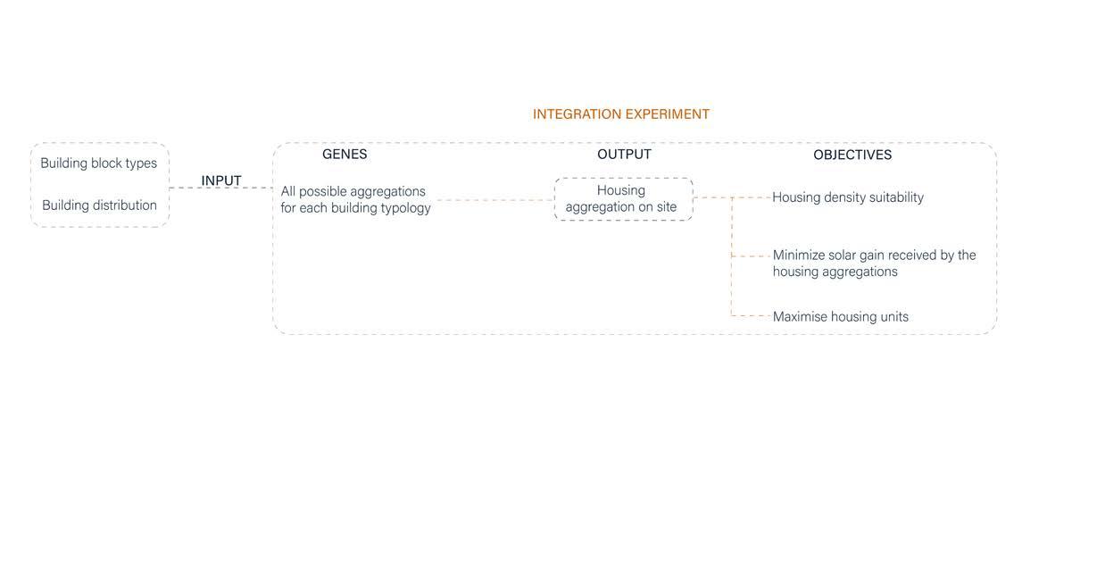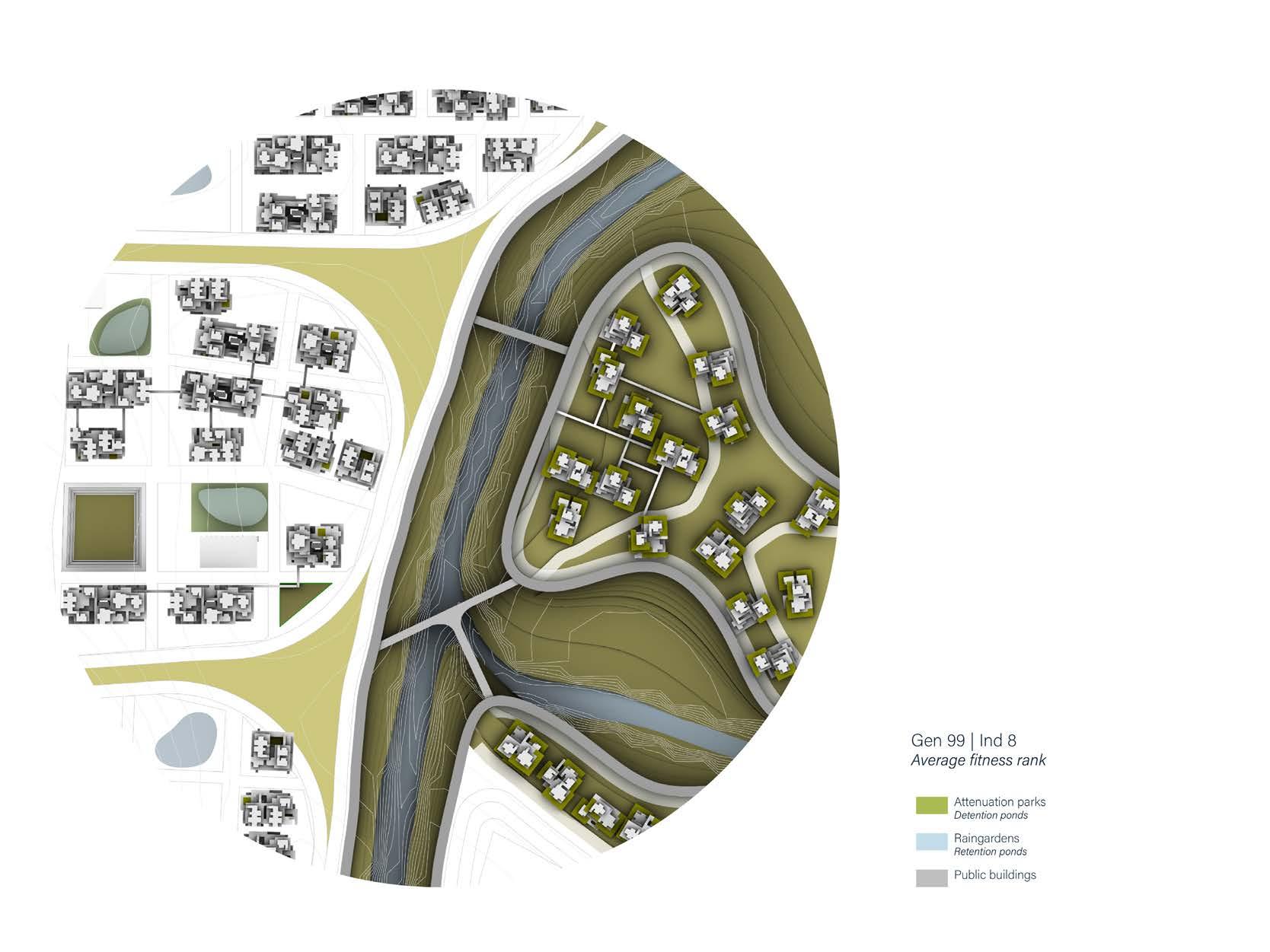 Following the individual explorations at urban and architectural scale, synthesis of the strategies was explored to allow integration of the solutions at the two scales. This was approached by experimenting with the distribution of buildings with multi objective optimisation through genetic algorithm (GA). The GA experiments considers the context of the two different types of clusters: the flood prone riparian clusters, and nonflood prone urban clusters. The outcome of the GA experiment, which is the building distribution at urban scale, were used as boundary conditions to generate individual buildings using the GA outlined in the previous section.