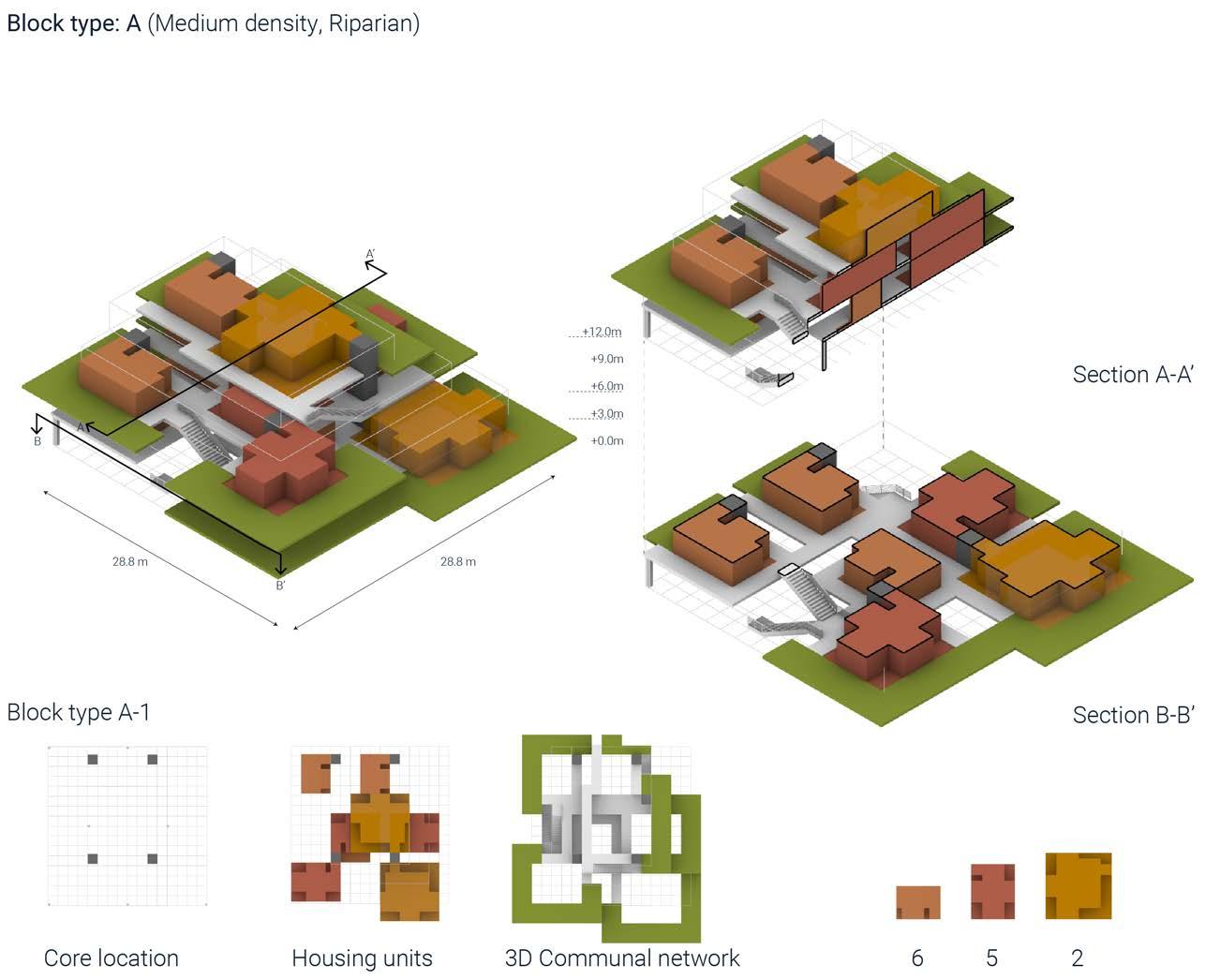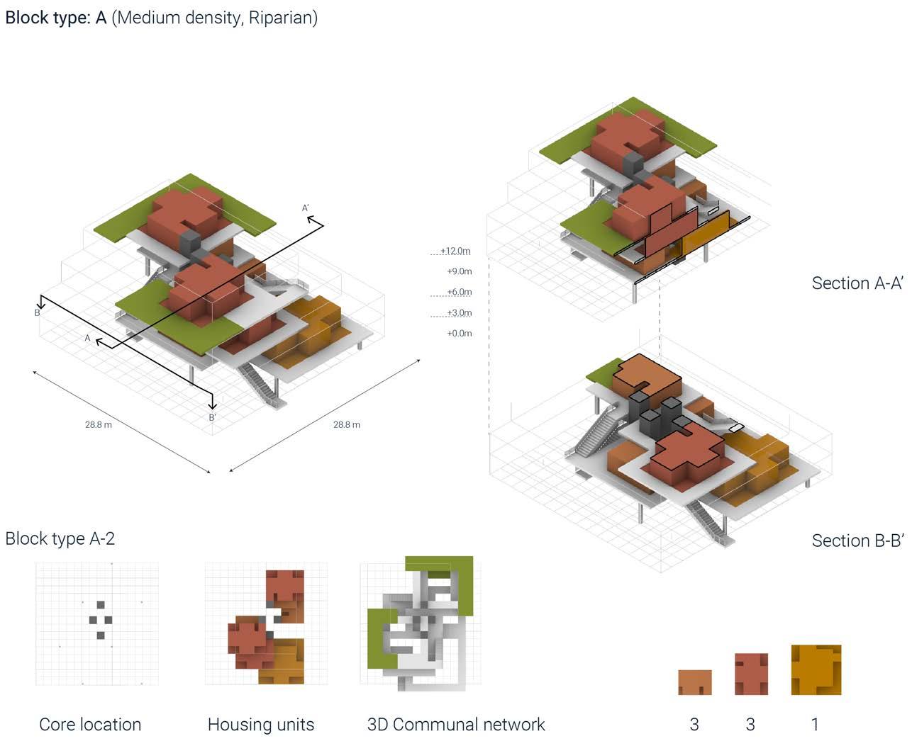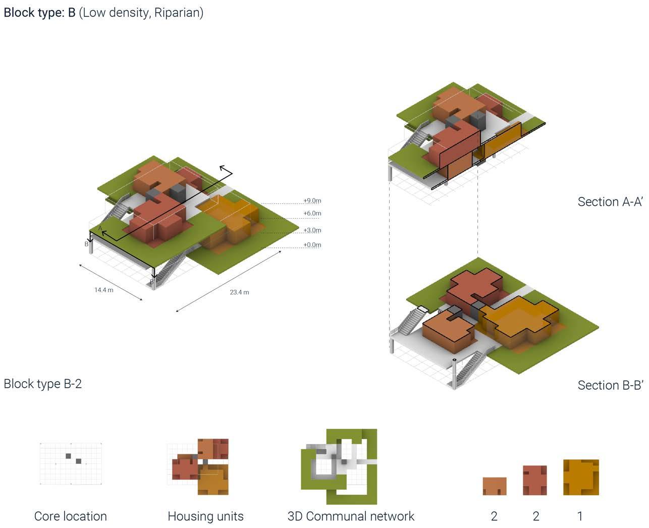 For the provision of housing, the project aimed to evolve vernacular typologies to suit the needs of modern households and future demographic growth. The architectural system pursues a framework that allows for spatial flexibility with emphasis on communal spaces, which is often lost in the existing government housing schemes. Bringing the urban scale and architectural scale solutions together, the resulting design aims to improve the neighbourhood’s resilience to flooding, at the same time taking into consideration the needs of its inhabitants.